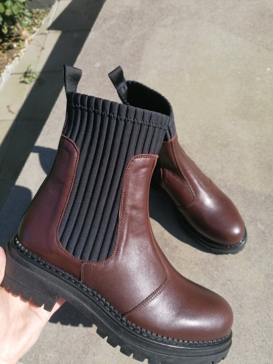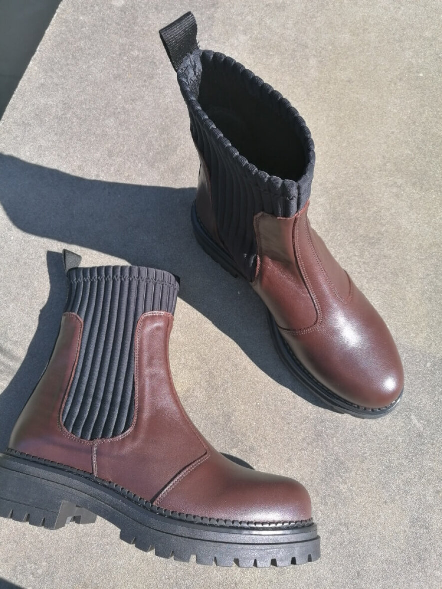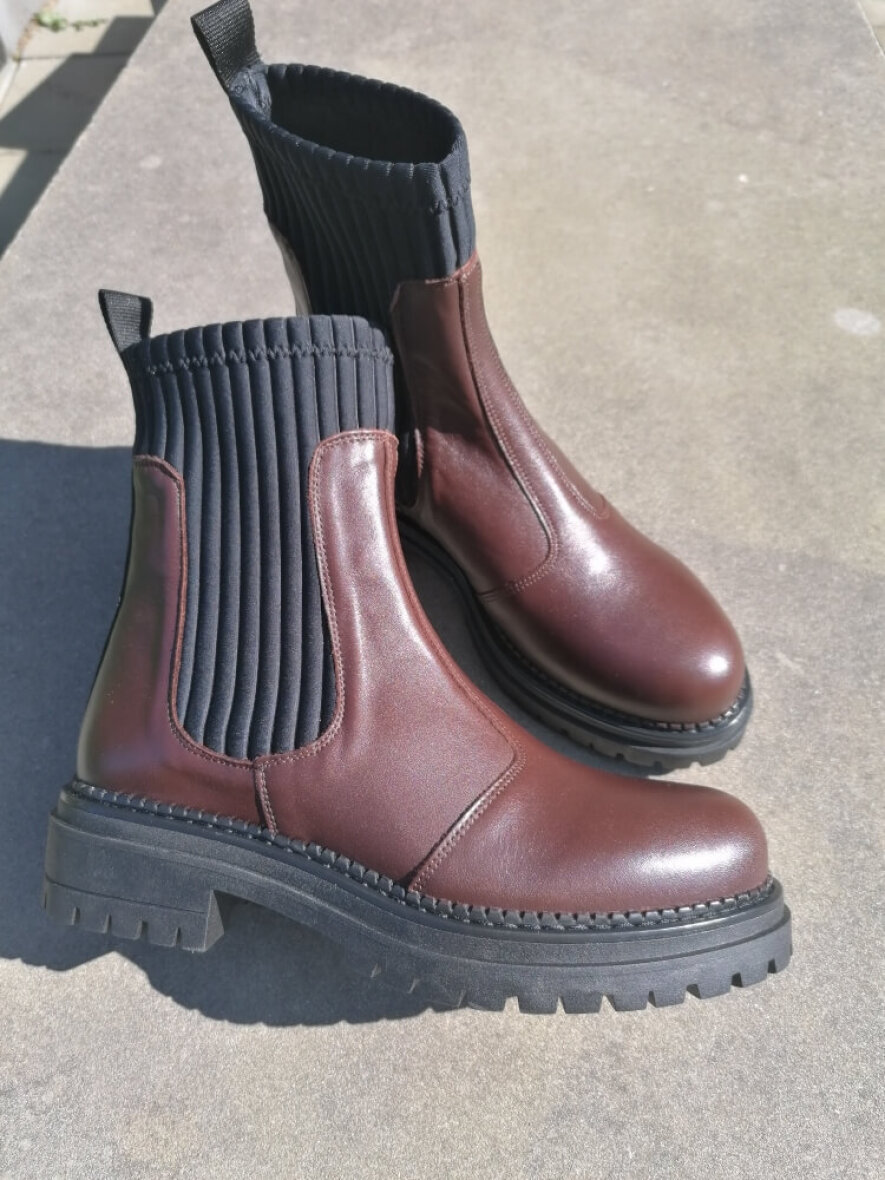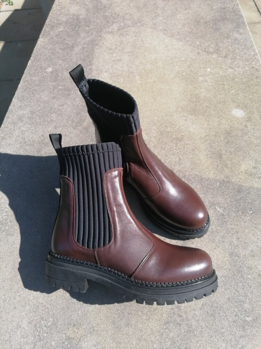 Vildt fede læderstøvler fra Ca'Shott med de populære grove gummisåler. I en skøn farve kombination af mørkebrun og sort. Støvlen har bred elastik i siderne så skoen er nem at komme. Med en pynte strop. En lækker støvle med god pasform, som passer godt til både kjole og bukser.