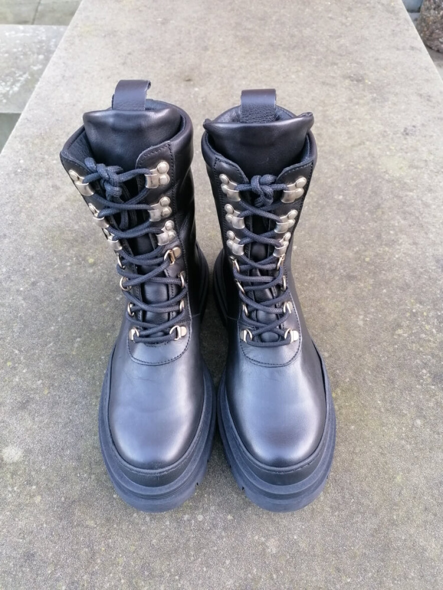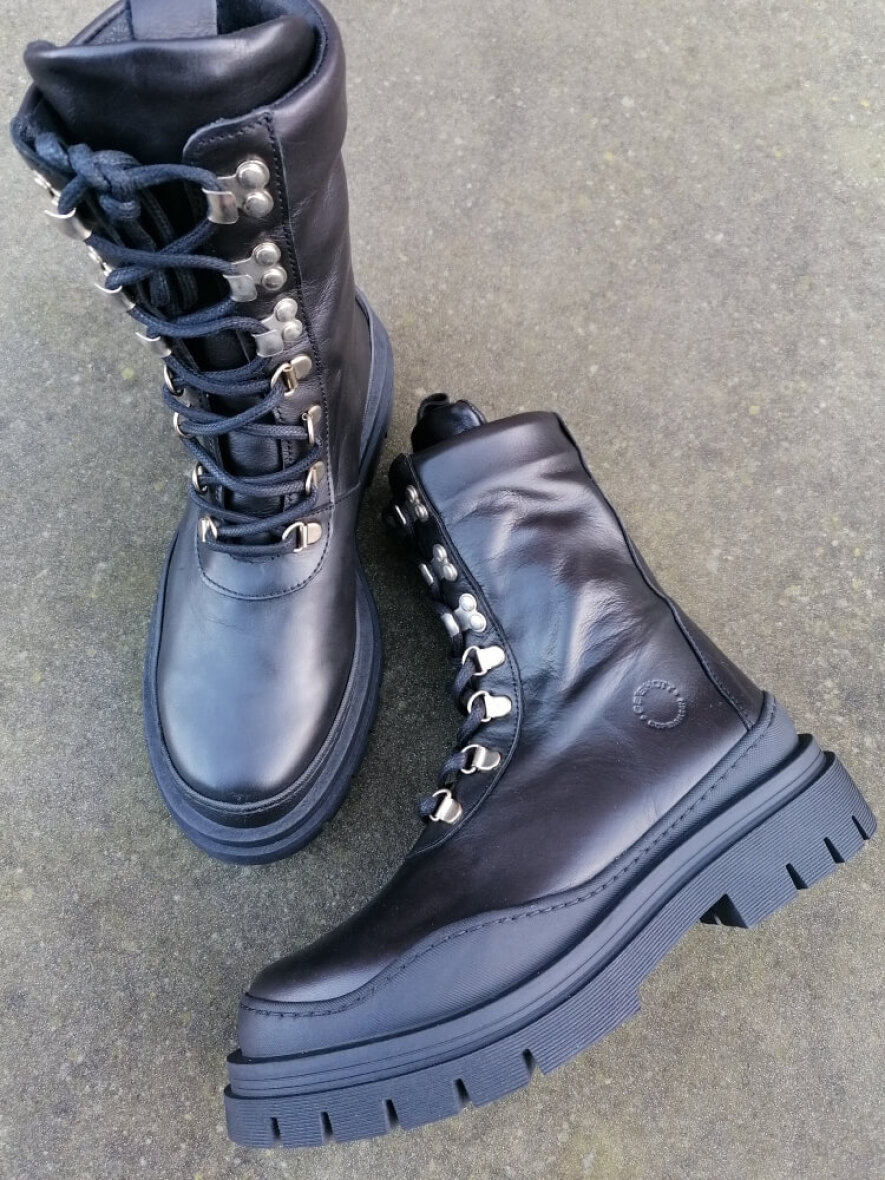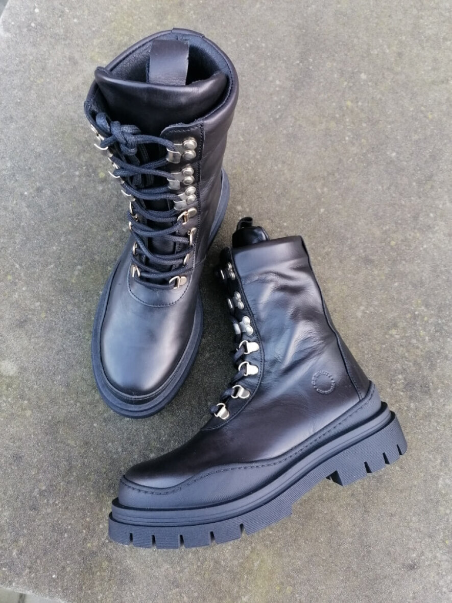 Super fede læderstøvler fra Ca'Shott med de populære grove gummisåler. Støvlen er lavet i glat skind udenpå. Støvlen er med snøreluk foran. En lækker støvle med god pasform, som med sit rå look passer godt til både kjole og bukser.