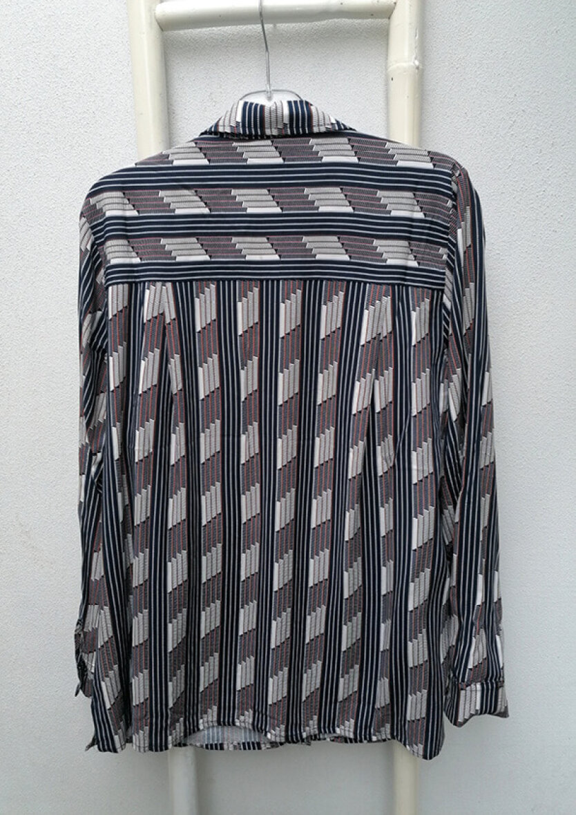 Skjorten er med krave og gennemgående knapluk på fronten. Ærmerne er med påsyet kant og knapluk.