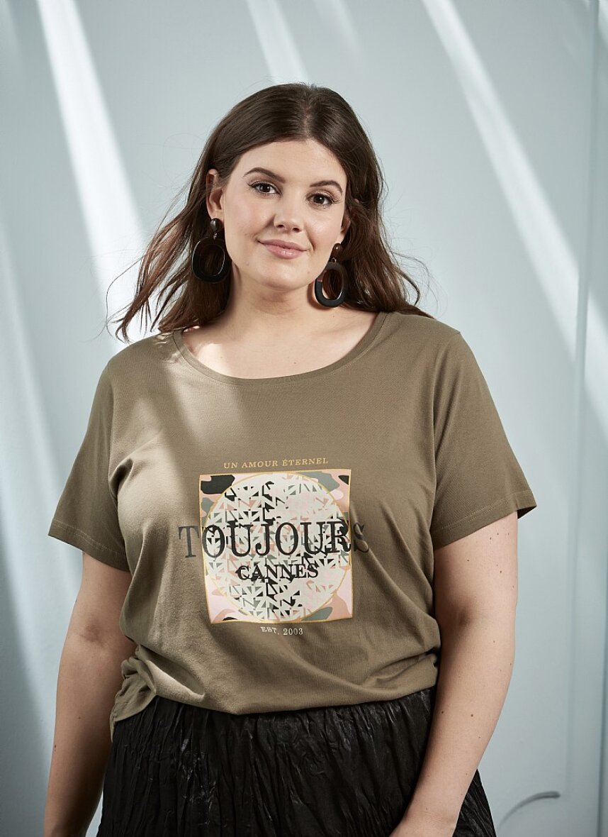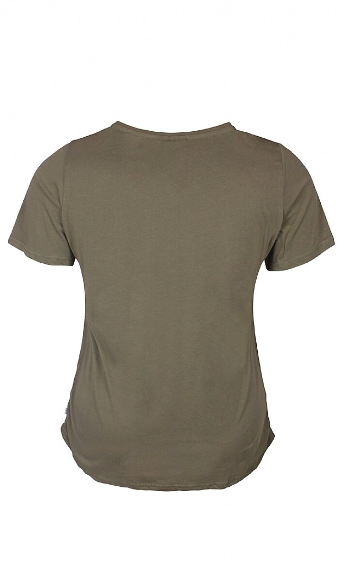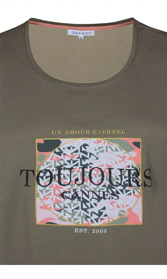 Lækker blød T-shirt fra Zhenzi i armyfarve. Rund halsudskæring og superflot print foran.