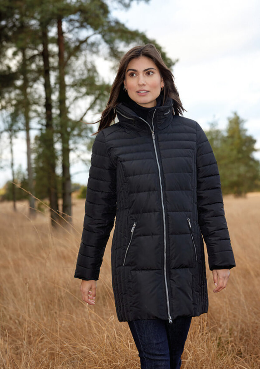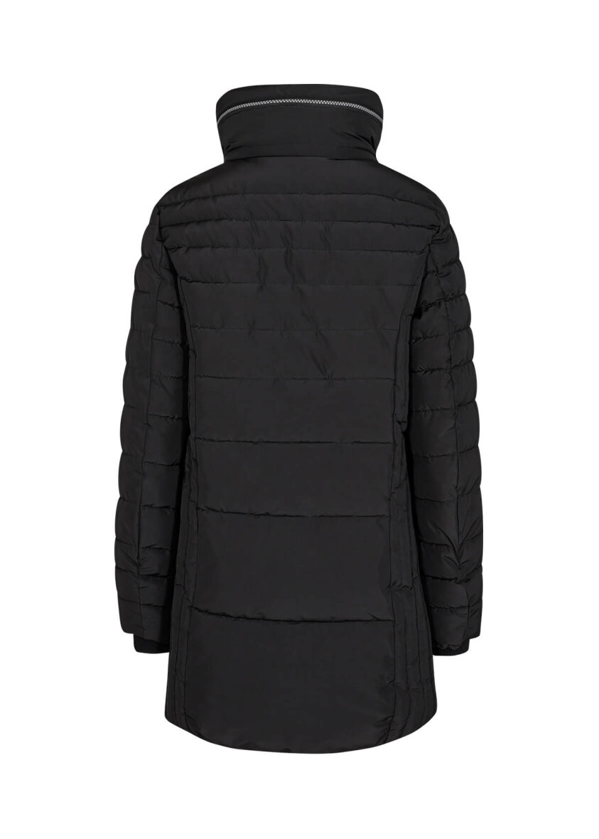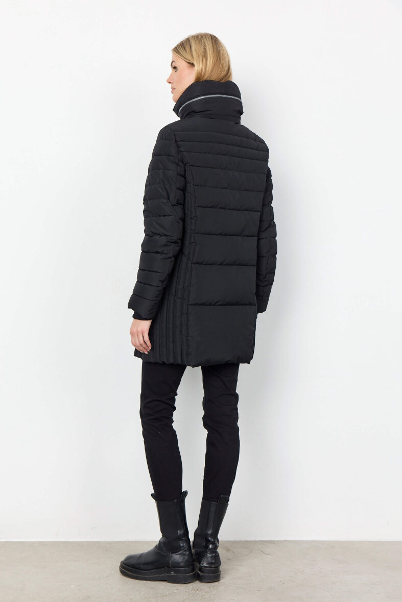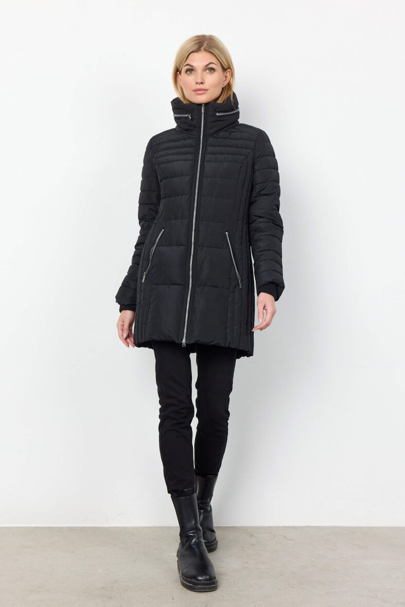 Lækker jakke fra Soyaconcept i en flot sort farve. Jakken er lavet i et quiltet design med forskellige quiltet mønstre. Jakken er med lynlåsluk foran som lynes godt op i høj hals. Smart design hvor jakkens hætte kan lynes ned i den horisontale lynlås øverst på jakken. Med lange ærmer og vindfang ved håndleddet holder man godt på varmen i denne skønne jakke.