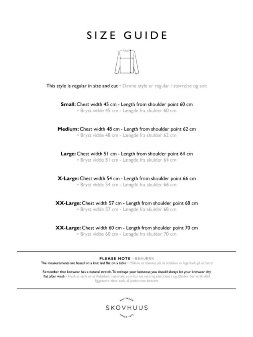 Skovhuus cardigan i sømandsstrik, hvor der er kælet for detaljen. Kanterne ved hals og åbning er ketlet, så der kommer en flot afslutning på cardiganen. Knapperne matcher garnets farve, hvilket giver et mere casual udtryk. Brug den med en farverig nederdel om foråret eller dine yndlingsbukser om efteråret. Strikken holder sin flotte pasform og farve rigtig godt.