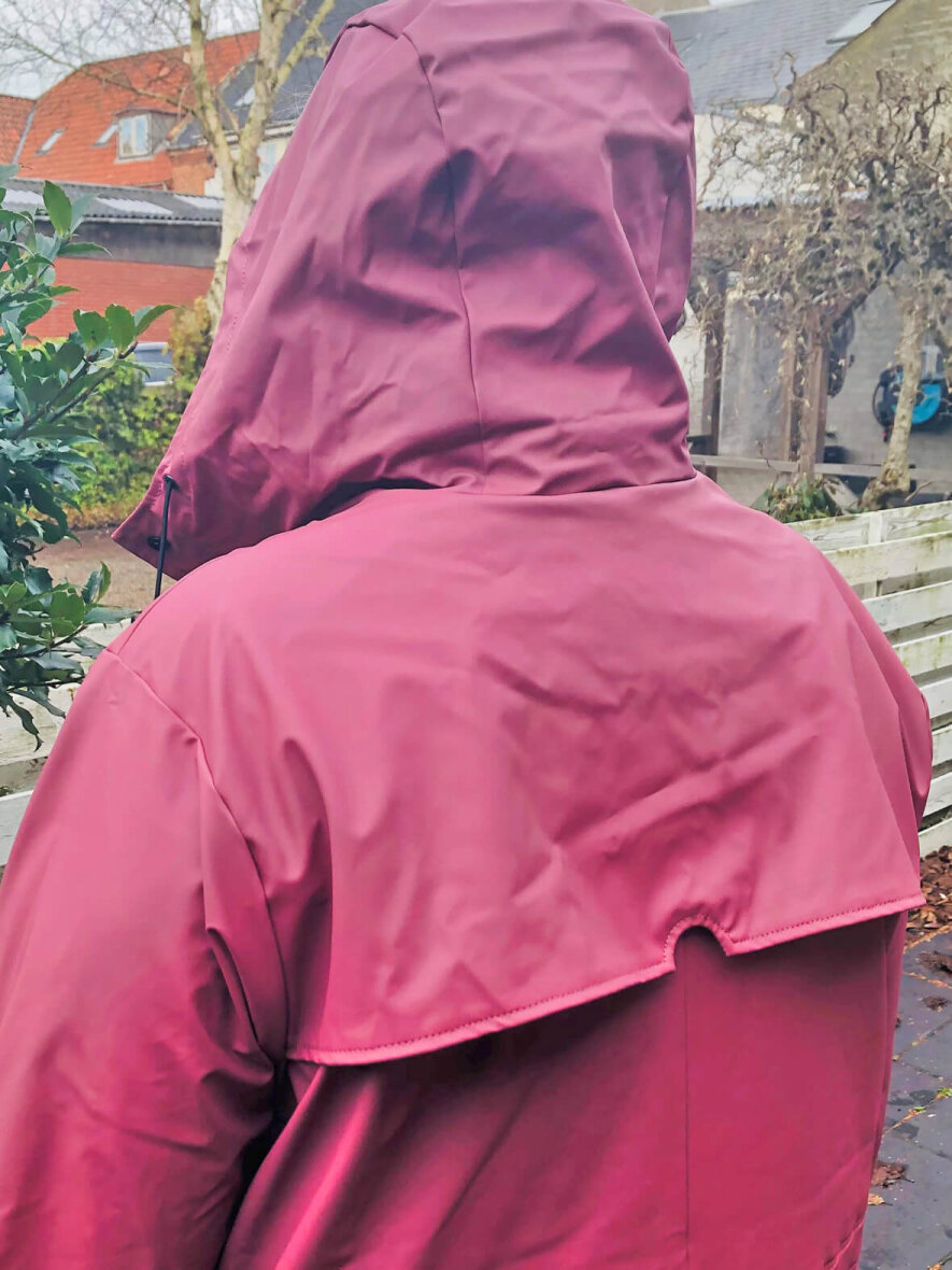 Blød og lækker regnjakke i rosa fra Zhenzi med hætte med snøre. Lange ærmer med elastikkant. To skrålommer med trykknapluk. Åndehuller på ryggen, hvor der er et regnslag over. Jakken lukkes med trykknapper i sort. Regnjakken er en smule længere bagtil. Vaskes før brug - max 5% krymp.