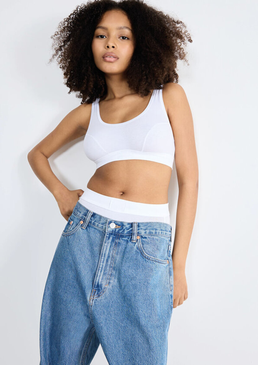 Den er lavet af blød og åndbar bomuldskvalitet og har et sømløst, rørformet bånd under brystet, der giver ekstra støtte og komfort. De strækbare flatlock-sømme er designet til at være usynlige under tøjet for et glat og behageligt look.