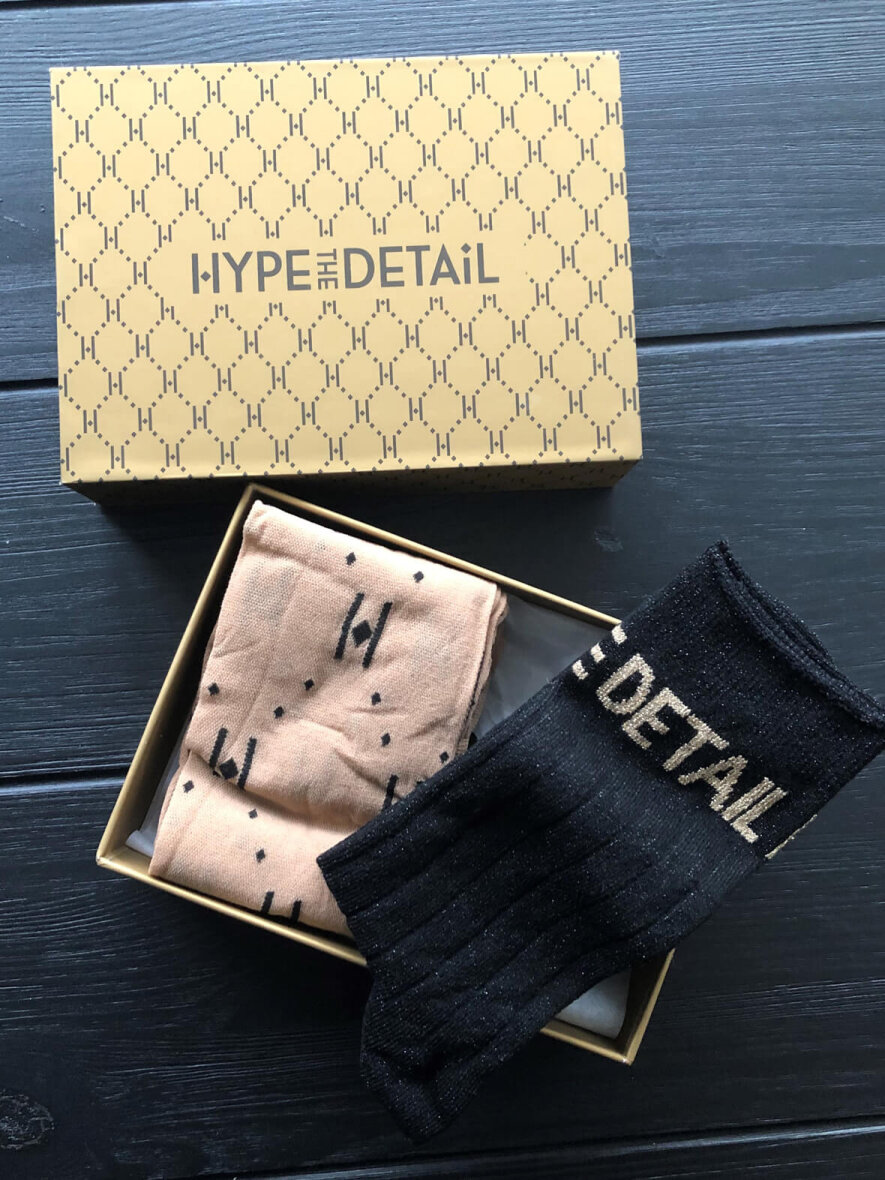 Eksklusiv lille gaveæske fra Hype the Detail, indeholdende et par strømpebukser i nude med logo på, samt et par strømper (one size 37-41) i sort - med logo i guld på skaftet.