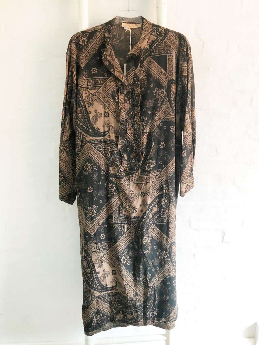 Super flot kjole fra Marta Du Chateau med lange ærmer med manchetknap. Rund hals med kinakrave. Flæser og knapluk ned foran. Super flot print i brunlige nuancer. Slidser i begge sider.