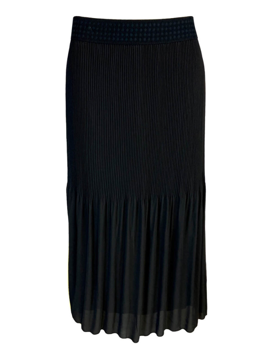 Super elegant nederdel fra 2-Biz i sort med plissé- og bølgeeffekt i bunden. Bred elastikkant i taljen. Fastsyet underkjole. Falder pænt ned om.