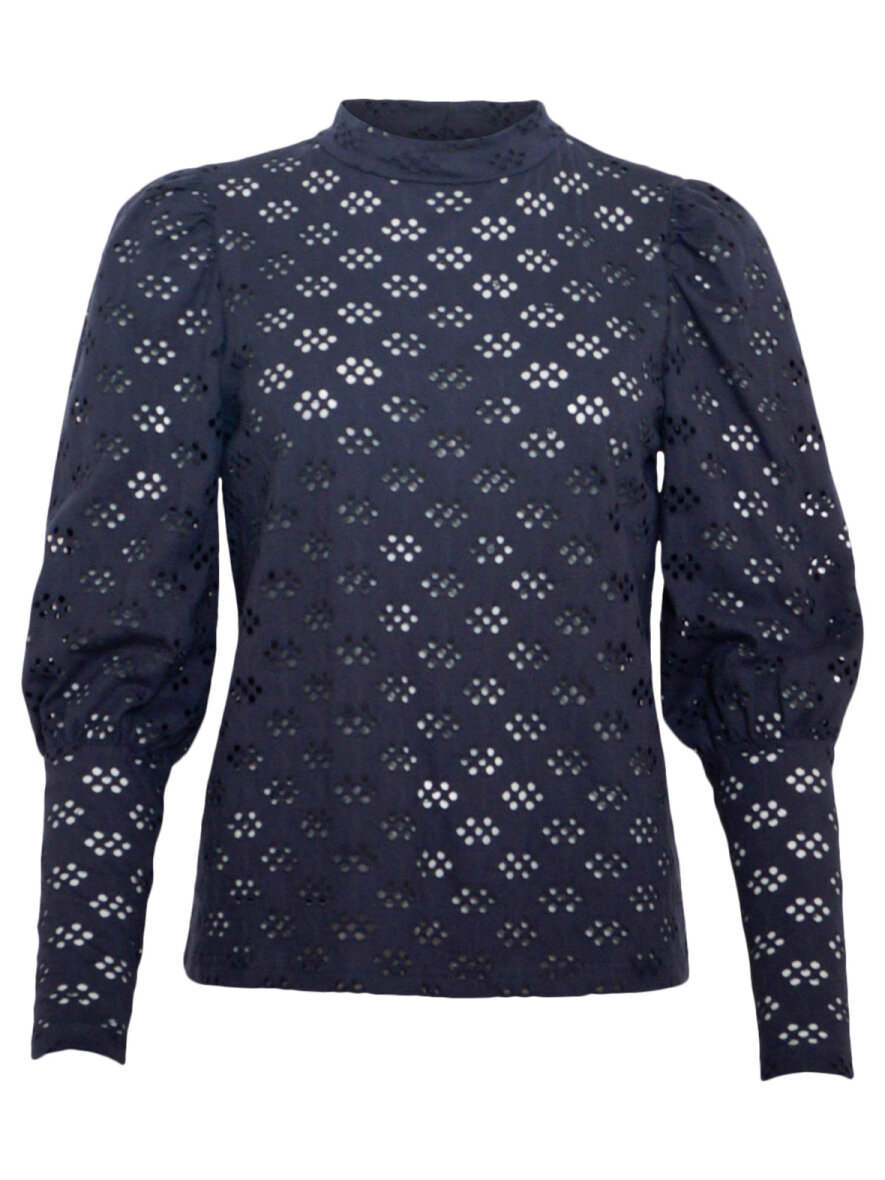 Smuk bluse med et mønster af små huller. Blusen har rund halsudskæring med høj hals. Lange ærmer med ballon-effekt. Fra albuen og til håndleddet sidder ærmet til. Max 5% krymp.