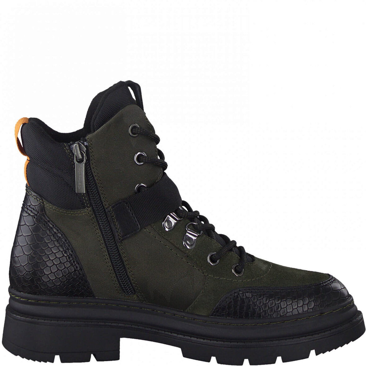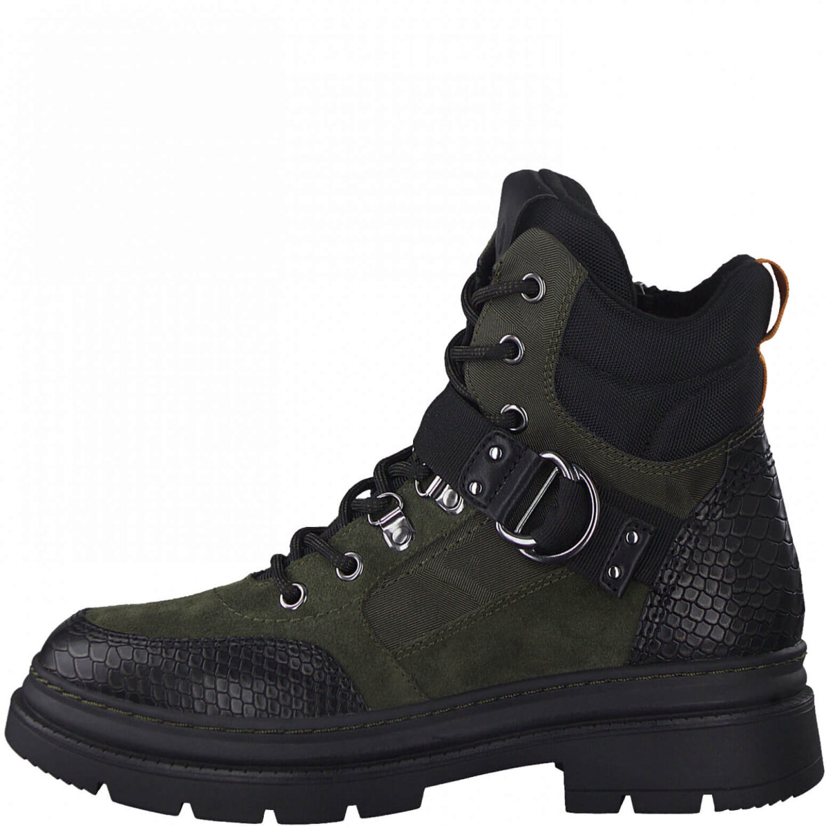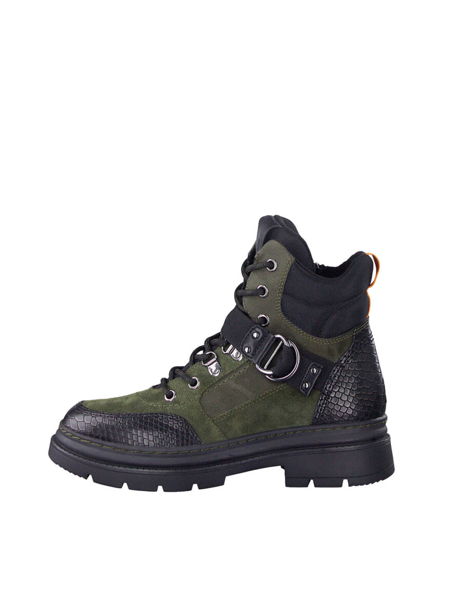 Fed støvle med flotte detaljer fra Tamaris. Overdelen er lavet i en kombination af materialer i fede grønne og sorte nuancer. Indeni er skoen foret med fleece med en dæksål i samme materiale. Støvlen er med indvendig lynlås, så den er nem at få af og på. Skoen kan reguleres med snørebånd foran. Med god pasform, rund snude og en flad hælhøjde på 4,5 cm.