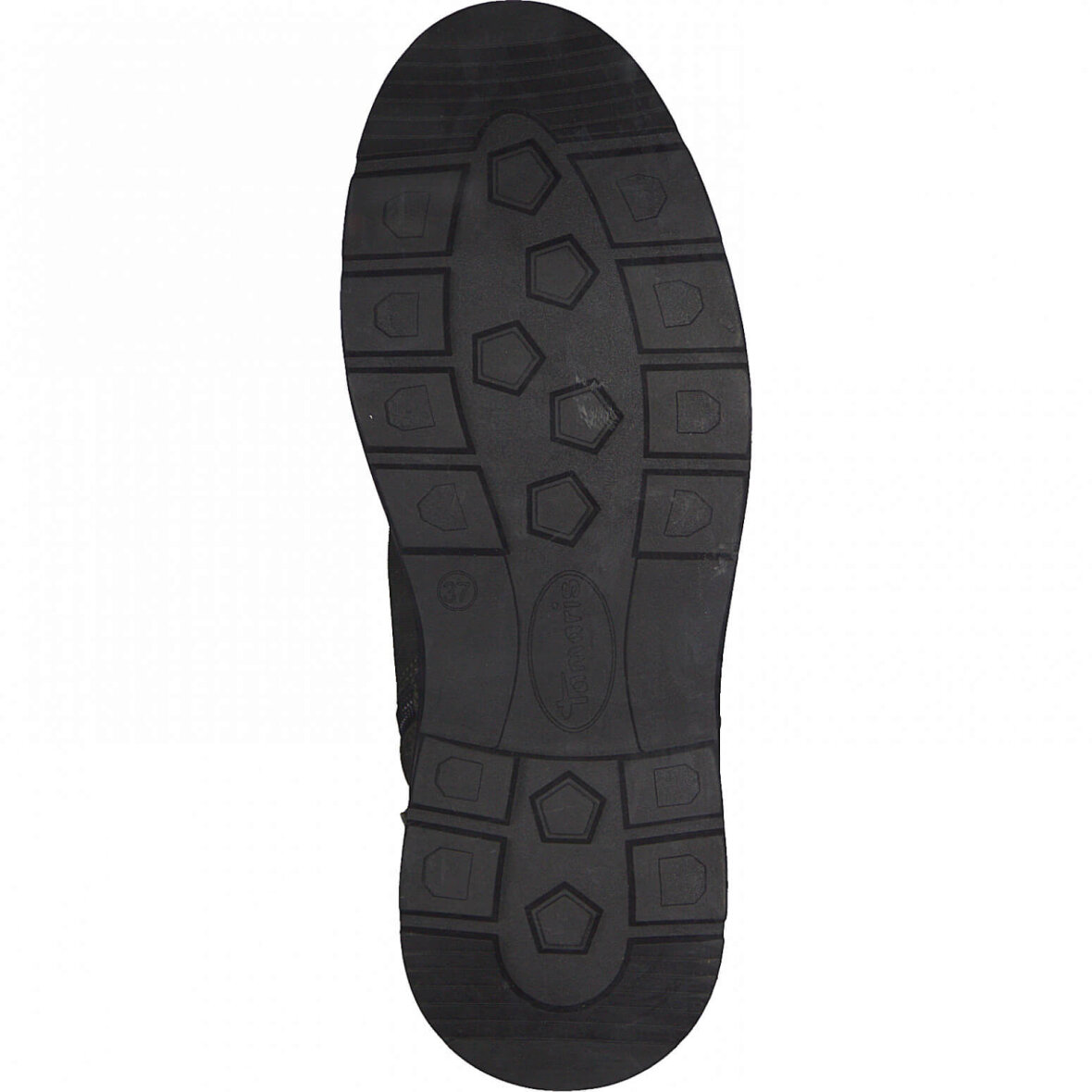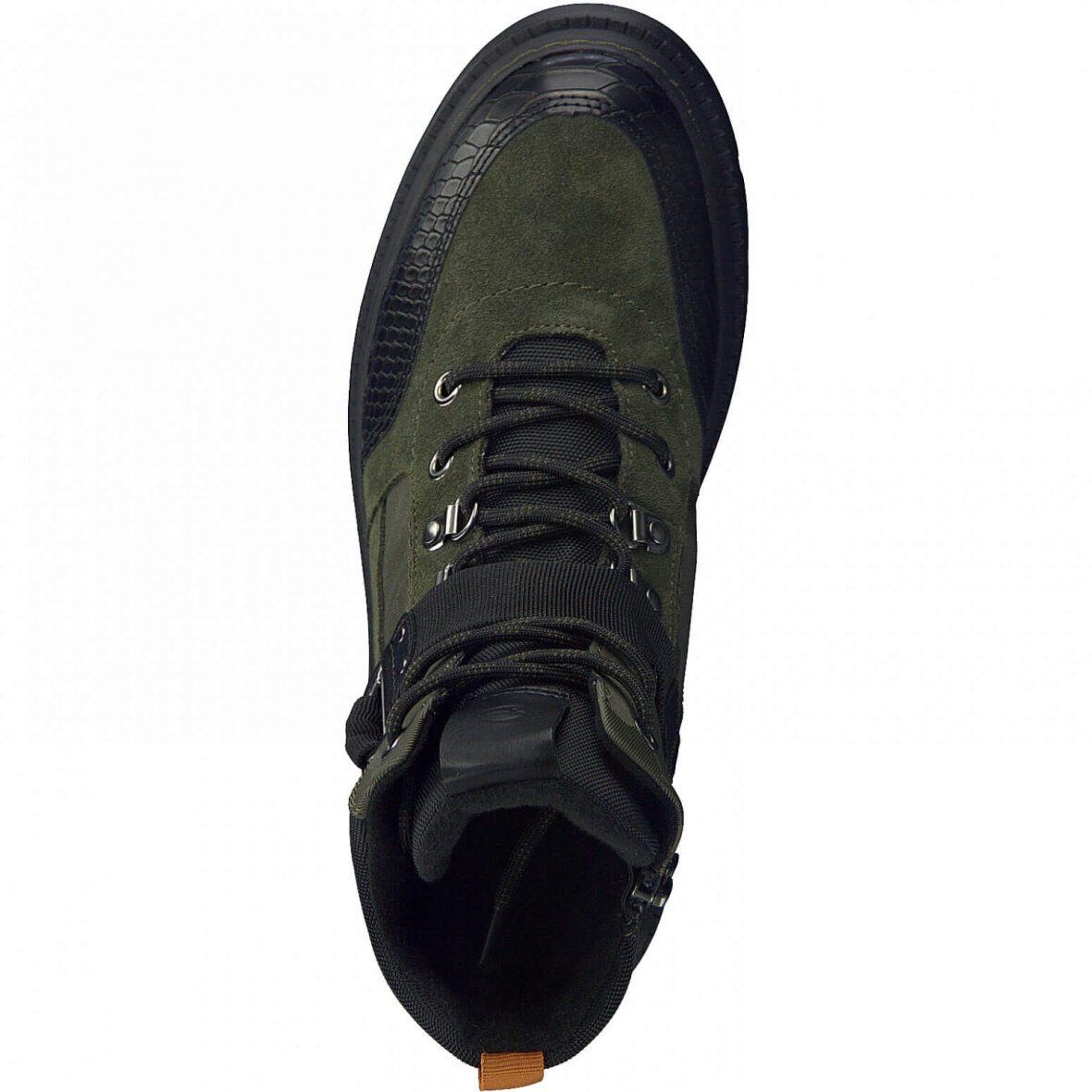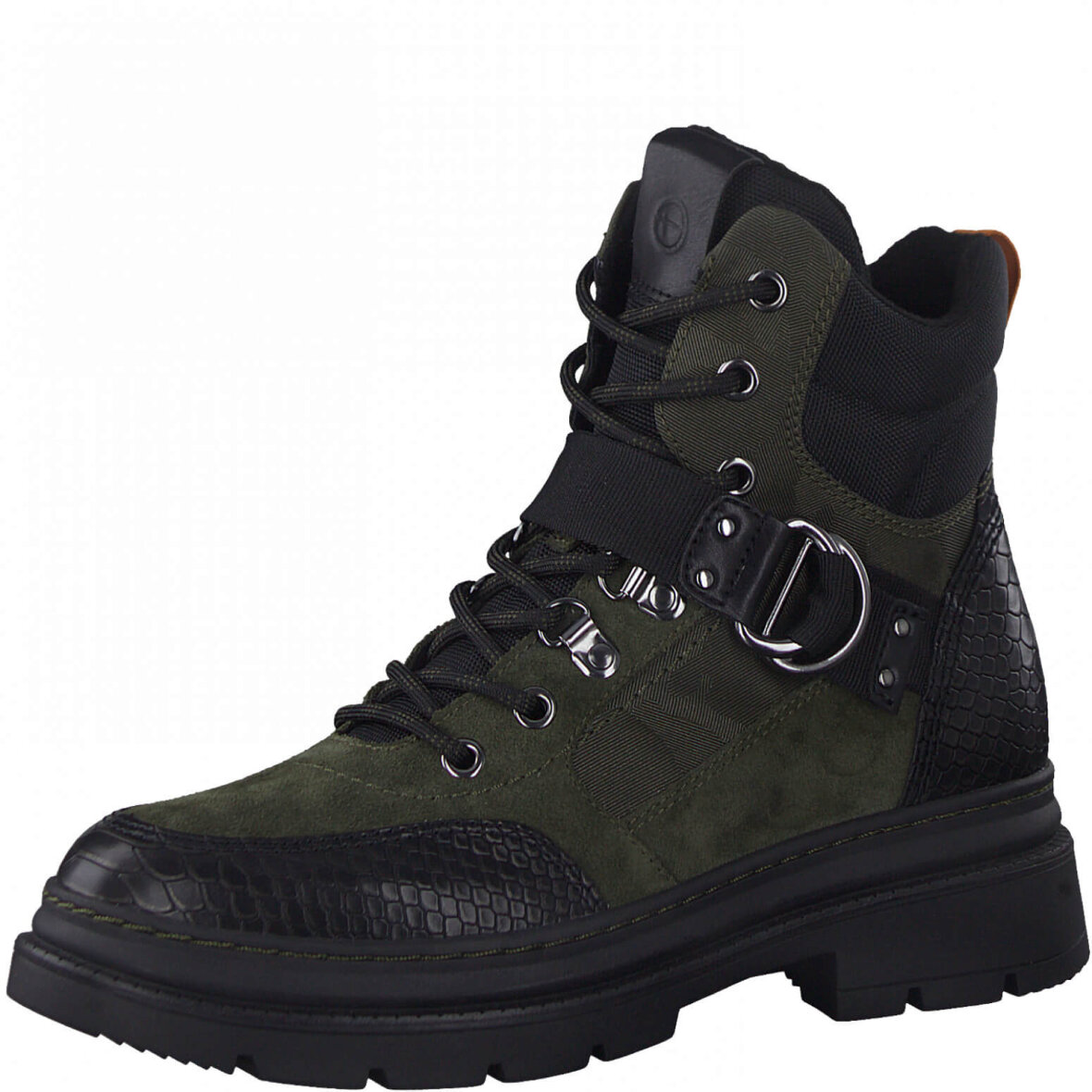 Fed støvle med flotte detaljer fra Tamaris. Overdelen er lavet i en kombination af materialer i fede grønne og sorte nuancer. Indeni er skoen foret med fleece med en dæksål i samme materiale. Støvlen er med indvendig lynlås, så den er nem at få af og på. Skoen kan reguleres med snørebånd foran. Med god pasform, rund snude og en flad hælhøjde på 4,5 cm.