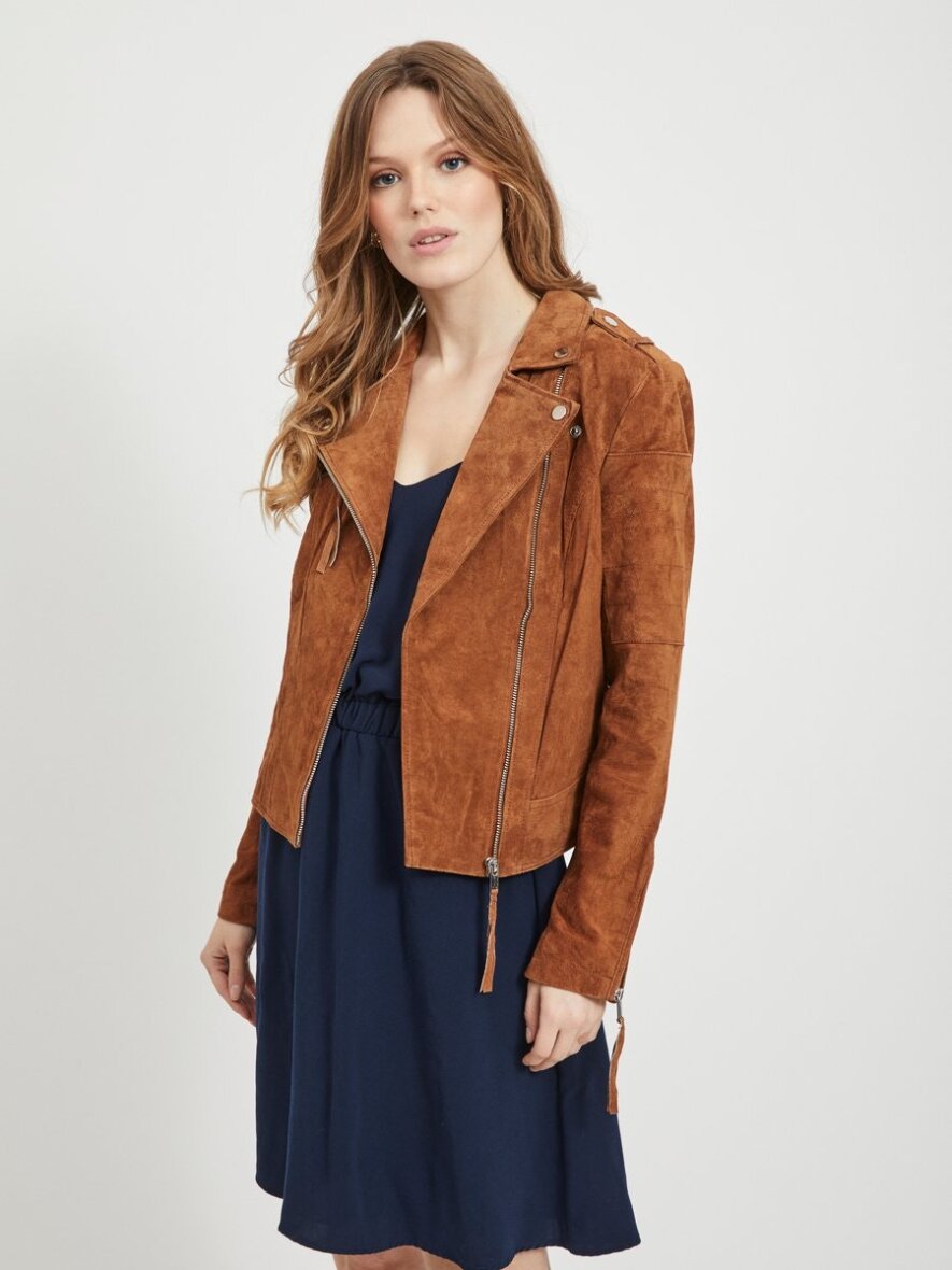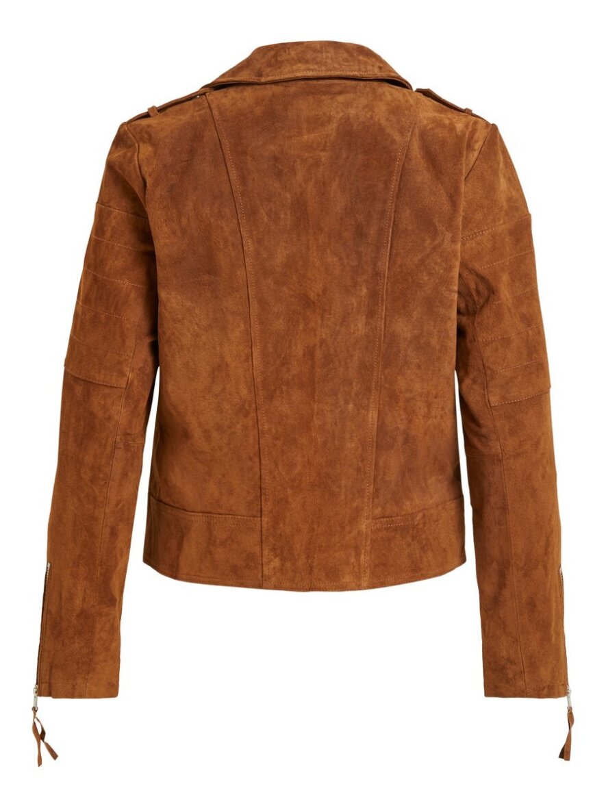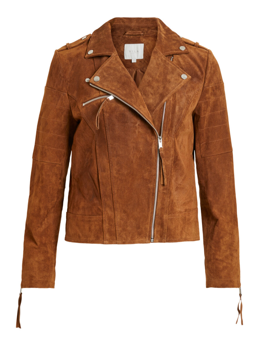 Lækker brun ruskinds jakke fra Vila. Jakken har flotte knappe detaljer samt en snyde lynlås lomme ved brystet.
