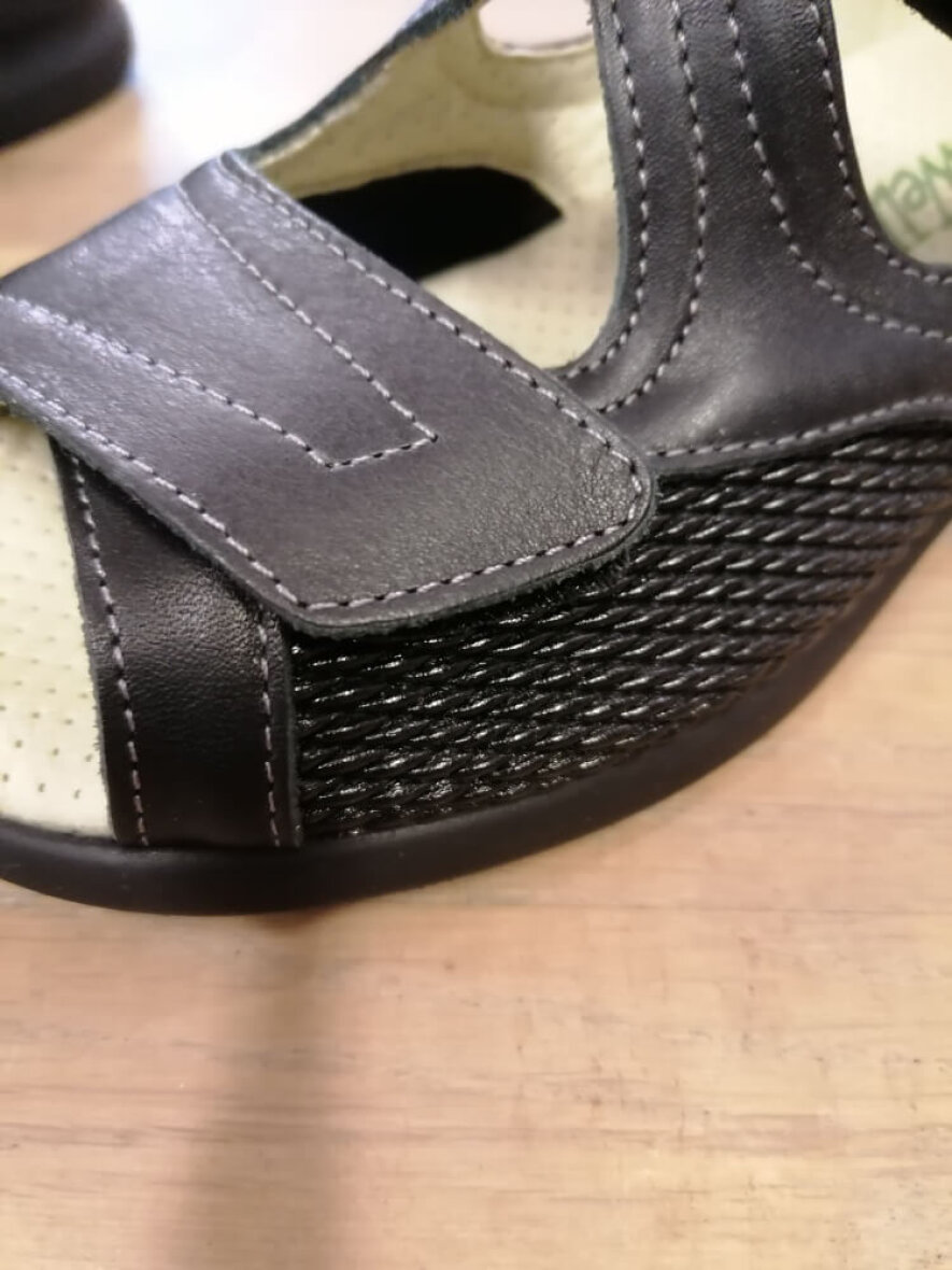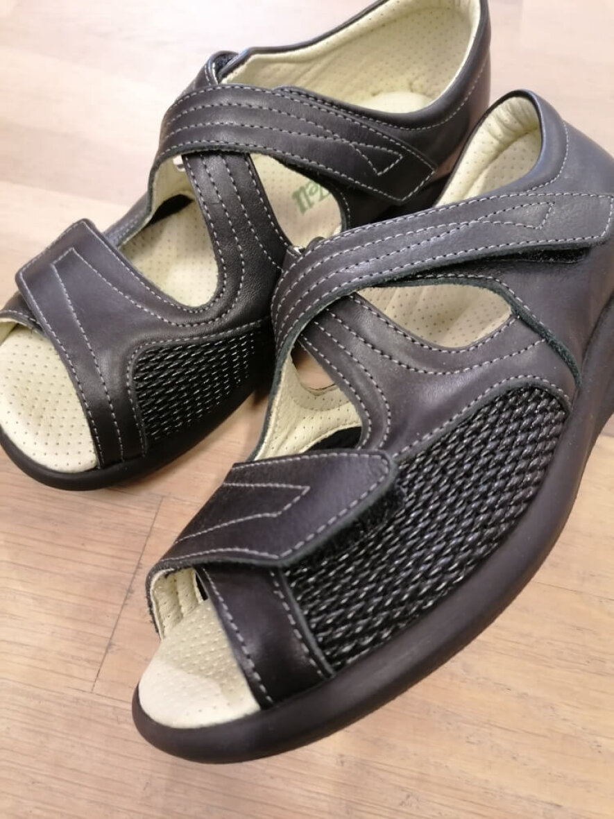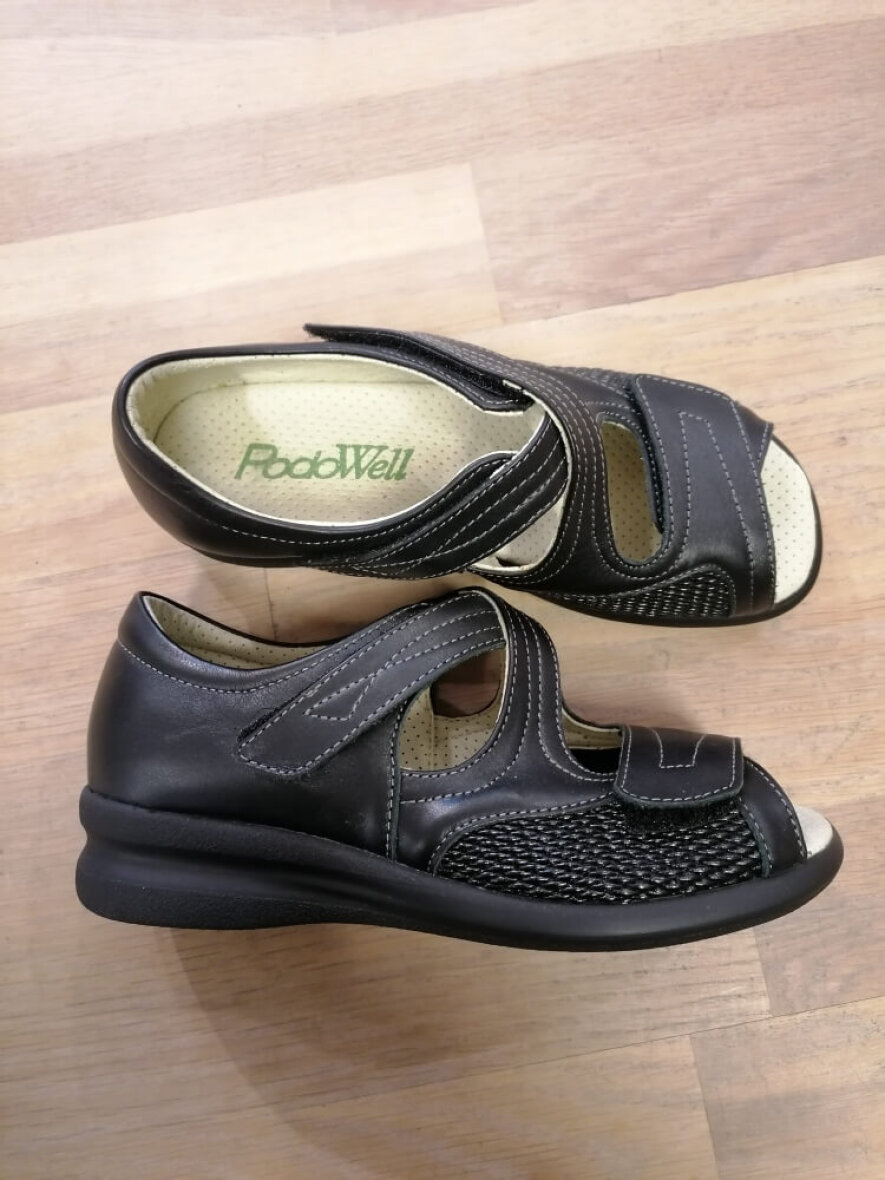 Komfortabel sandal fra Podowell i den skønneste kvalitet. Sandalen er lavet i skind med flotte detaljer i blødt neopren. Der er indsat neopren så de dækker knyste områderne på begge sider - hvilket betyder at du kan bruge sandalerne selvom du har problemer med knyster. Skoen har tre regulerbar remme, så du kan tilpasse den til hævet og følsomme fødder. Perfekt fodtøj til hævede fødder og ankler. Særligt velegnet til ældre.