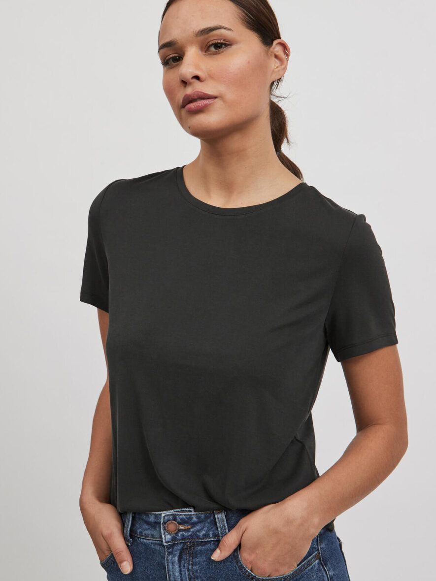 Super blød og let T-shirt fra VILA. T-shirten har rund halsudskæring og korte ærmer. Blødt og strækbart materiale.