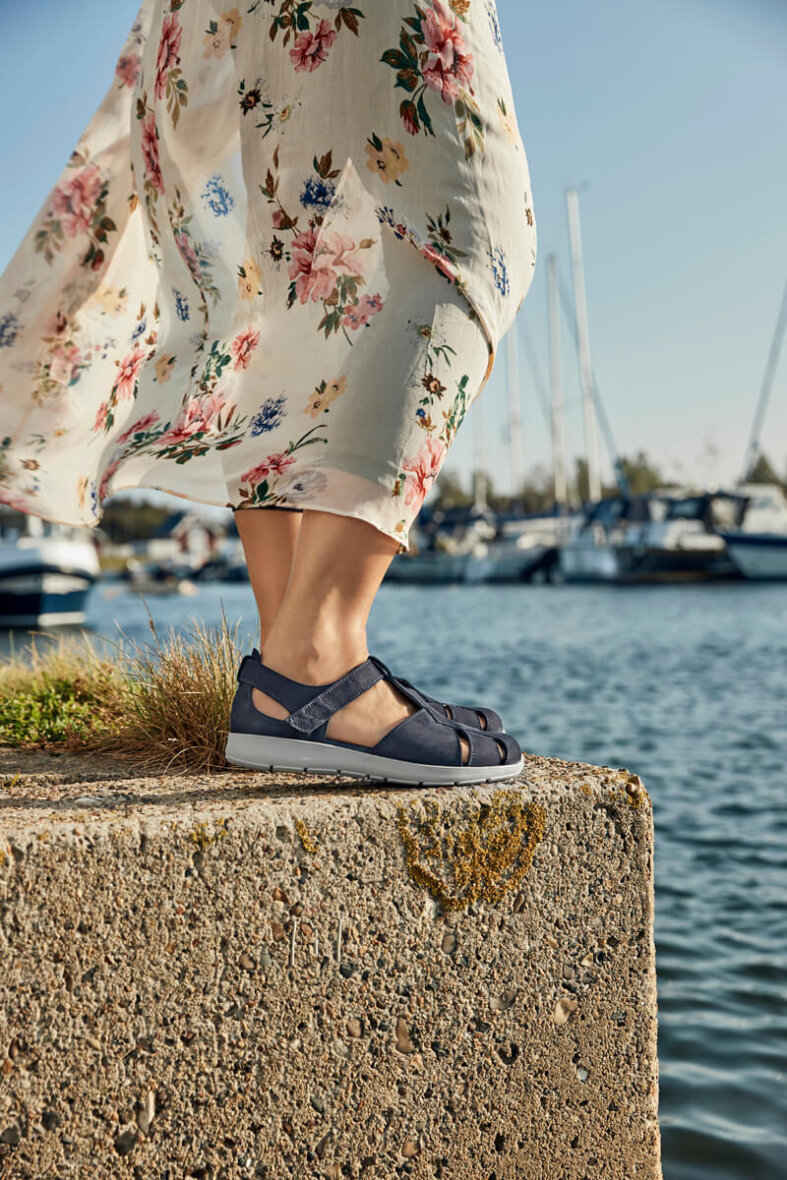 Flot og komfortabel lukket sandal fra New Feet. Overdelen er lavet i nubuck skind. Skoen er med en regulerbar velcro rem ved anklen, så du kan justere den så den passer til din fod. Skoen har en fast hælkappe som giver en god stabilitet når man går.