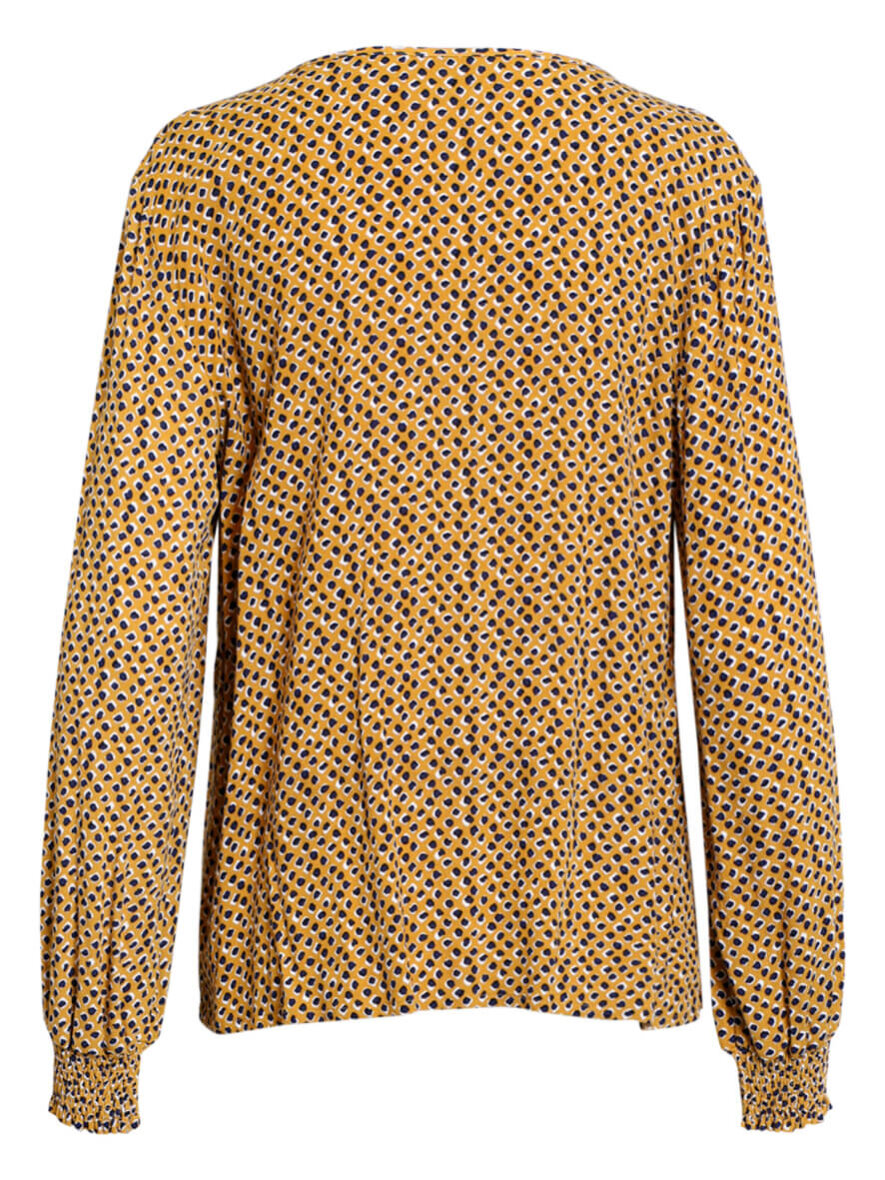 Fantastisk smuk bluse med prikker fra Brandtex, med rund hals og bindebånd foran i halsen. Smock-effekt i hals og ærmer.
