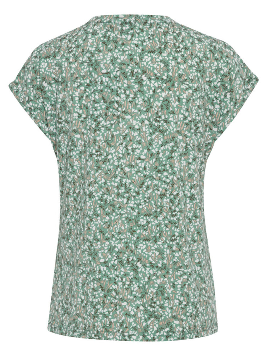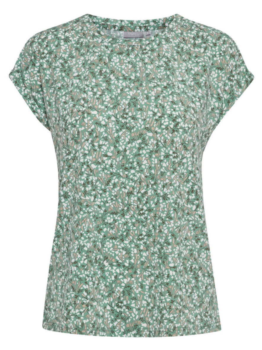 Lækker blød T-shirt fra Fransa med rund hals og små korte ærmer med lille opsmøg. All-over blomsterprint. Max 5% krymp.