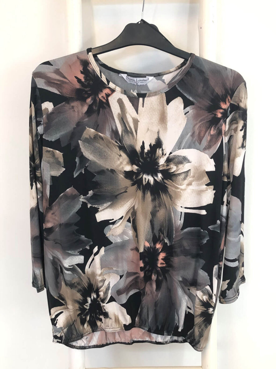 Lækker bluse i en blød kvalitet fra Sara Louise. Blusen har rund hals og 3/4 lange ærmer. Forneden er der elastikkant. Super flot blomstermønster.