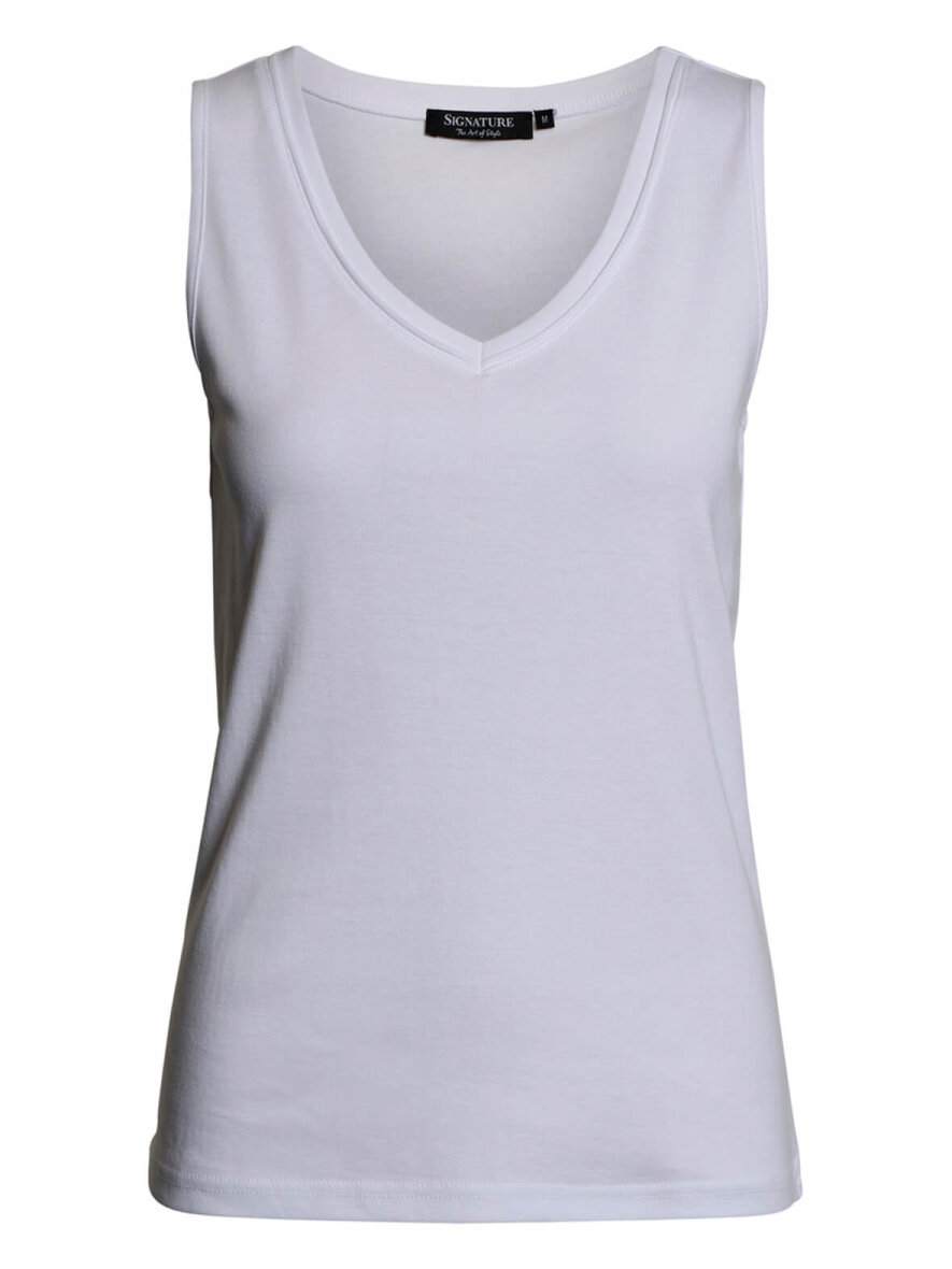Lækker basis top i super behagelig og komfortabel kvalitet fra Signature. Toppen er designet med bred V-hals og ensfarvet. Kan bruges til en nederdel og under en fin strik eller bluse. Max 5% krymp.