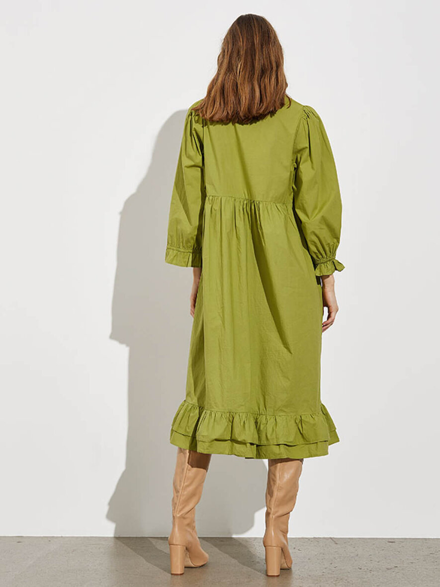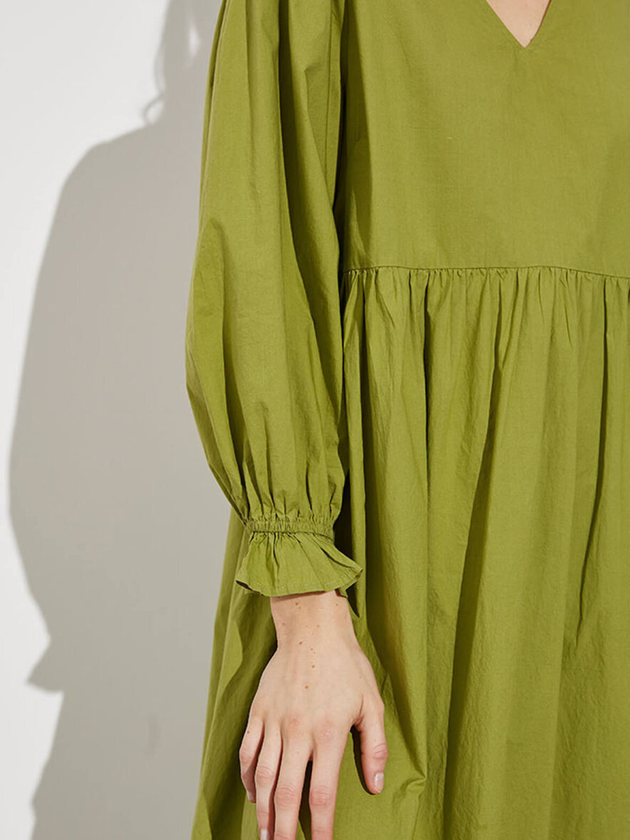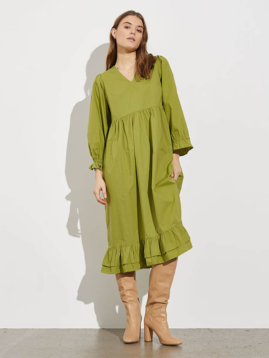 Super flot kjole fra mbyM i en lækker grøn farve og masser af lækre detaljer. V-udskæring og 3/4 lange ærmer. Lille flæsekant ved ærmerne med elastikkant. Overskæring under brystet og nederst på kjolen der giver de fineste læg og flæser.