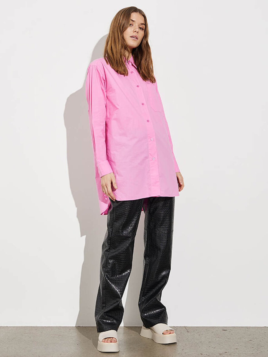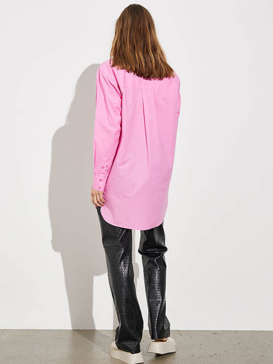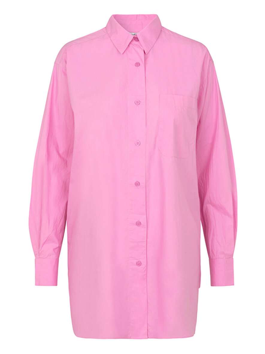 Lækker skjorte fra mbyM i en smuk pink farve. Klassisk krave med knapluk ned foran og en brystlomme. Lange ærmer med manchetknapluk. Skjorten er en smule længere i modellen end en almindelig skjorte. Let runding forneden og en smule længere bagtil. Max 5% krymp.
