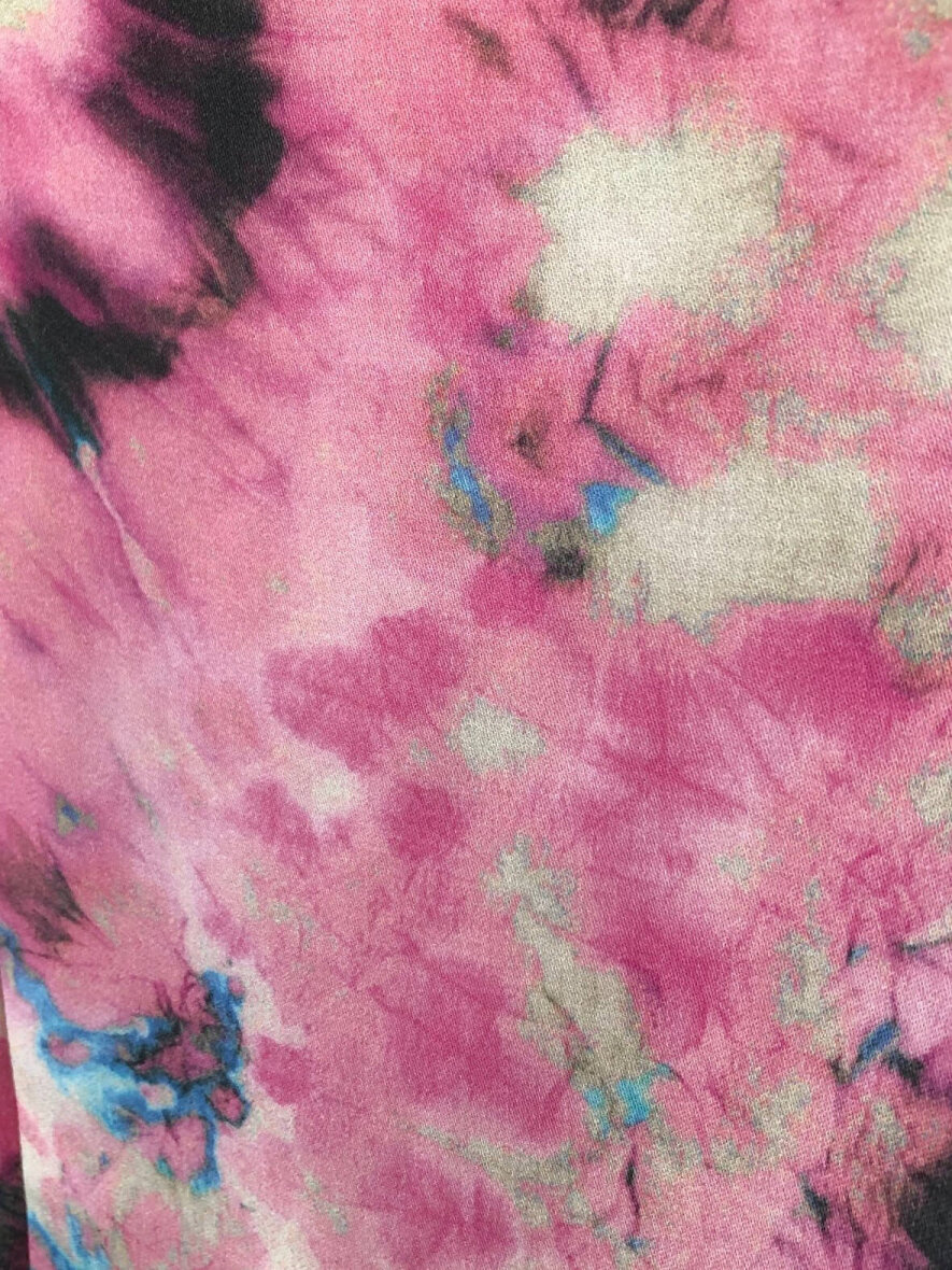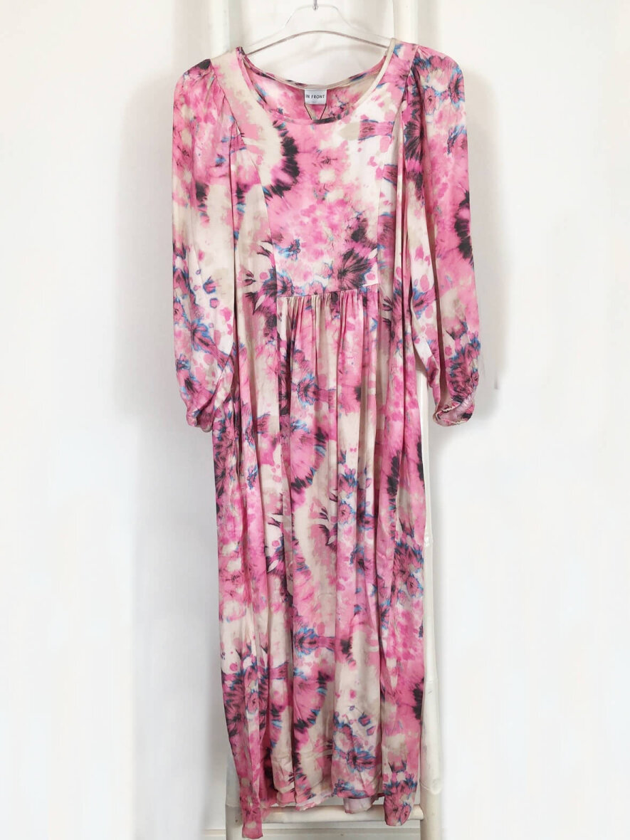 Smuk kjole fra In Front i et lækkert lyserødt mix - tie-dye. Rund hals og 3/4 lange ærmer med elastikkant. To sidelommer. Kjolen er skåret i taljen, så skørtet har smarte flæseeffekter og et flot svaj.