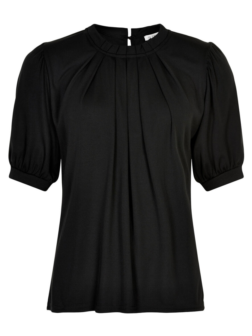 Skøn T-shirt fra IN FRONT i sort. T-shirten har 1/2 lange ærmer og rund hals med lille flæsekant - lukkes i nakken med en lille knap. T-shirten har små læg foran ved halsen og ned..