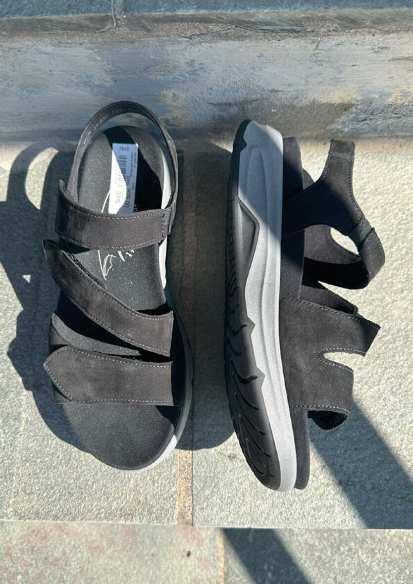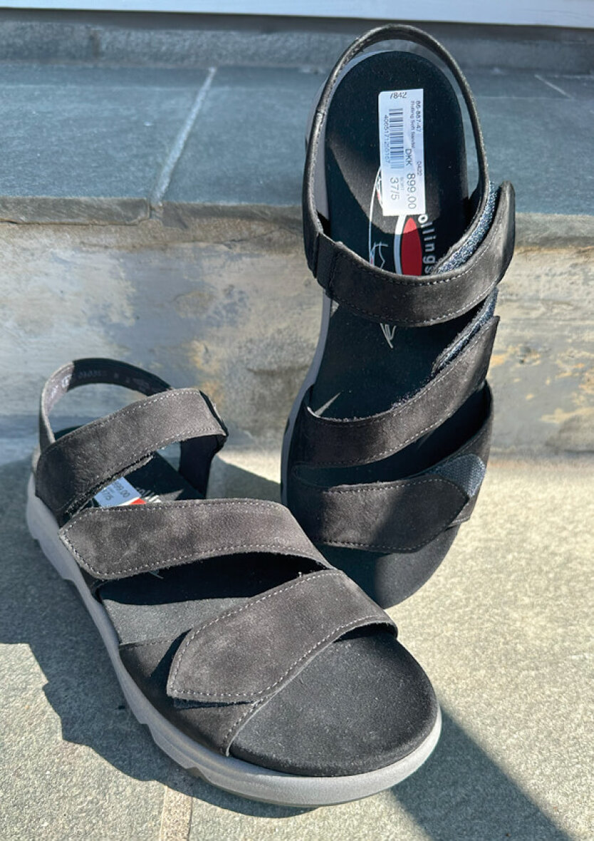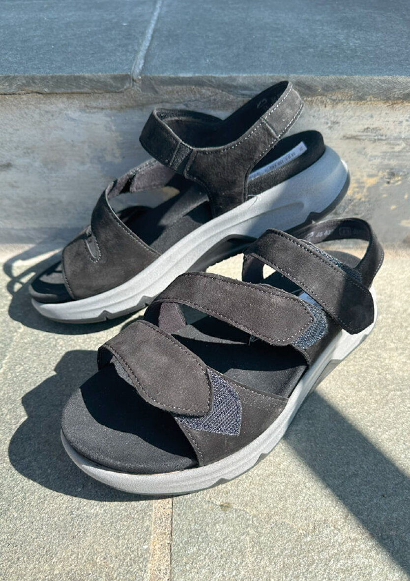 Klassisk og enkel sort Rollingsoft sandal fra Gabor. Sandalen er udført i sort nubuck på overdelen. Sandalen er med tre remme og kan alle reguleres med velcroluk, så den nemt kan tilpasses foden. Sandalen er også lavet med rem om hælen, som giver en god stabilitet.