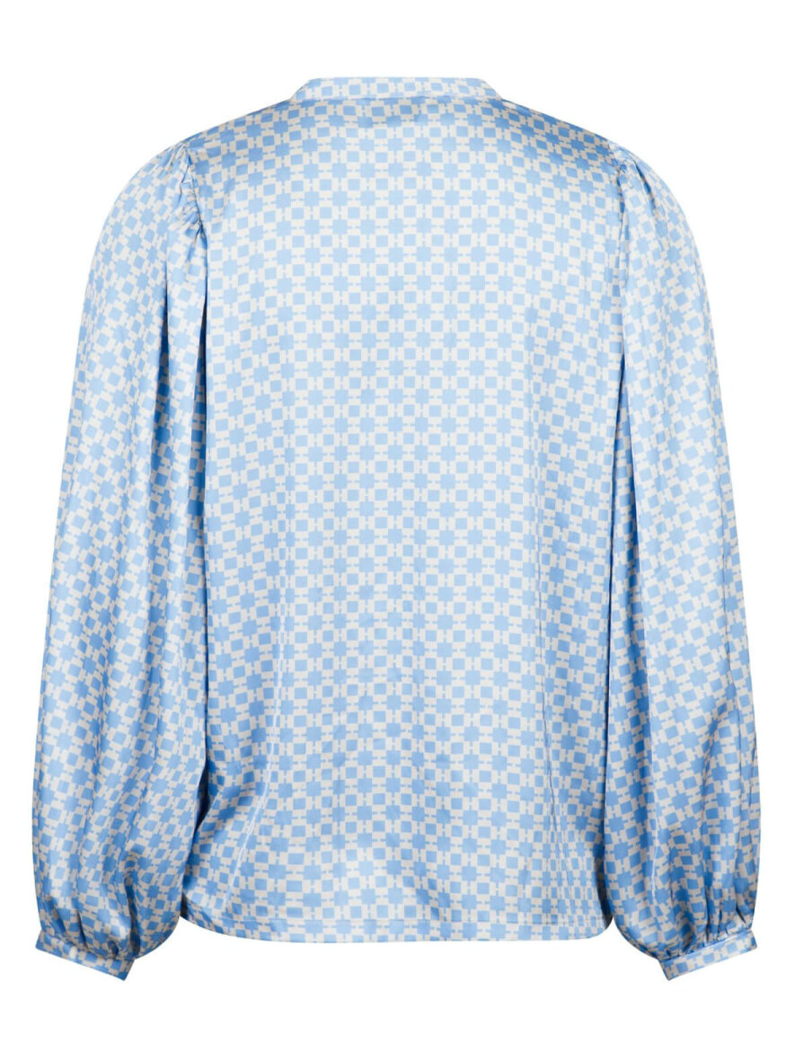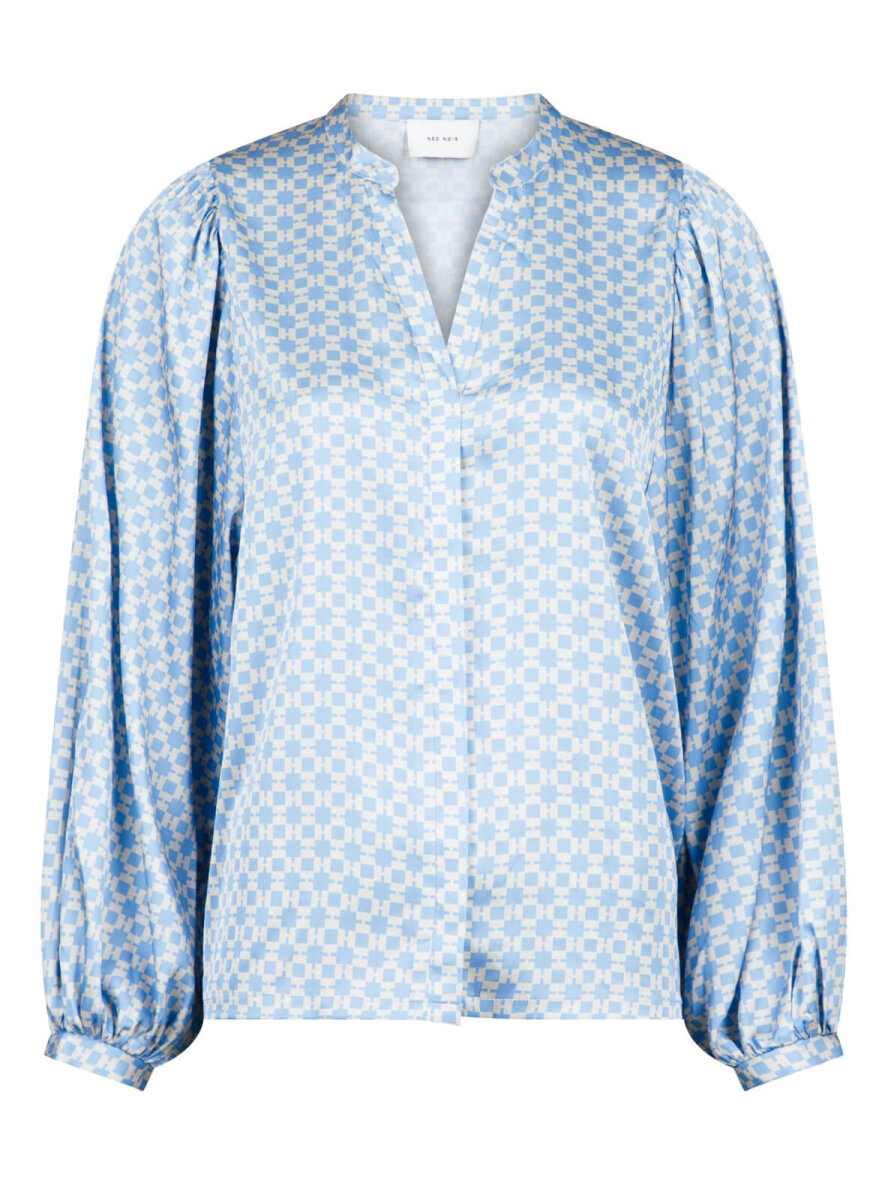 Smuk, feminin satin skjorte fra Neo Noir i beige og lyseblå. Skjorten har et superflot grafisk print. V-udskæring, skjult knapluk ned foran. Lange ærmer med puf.