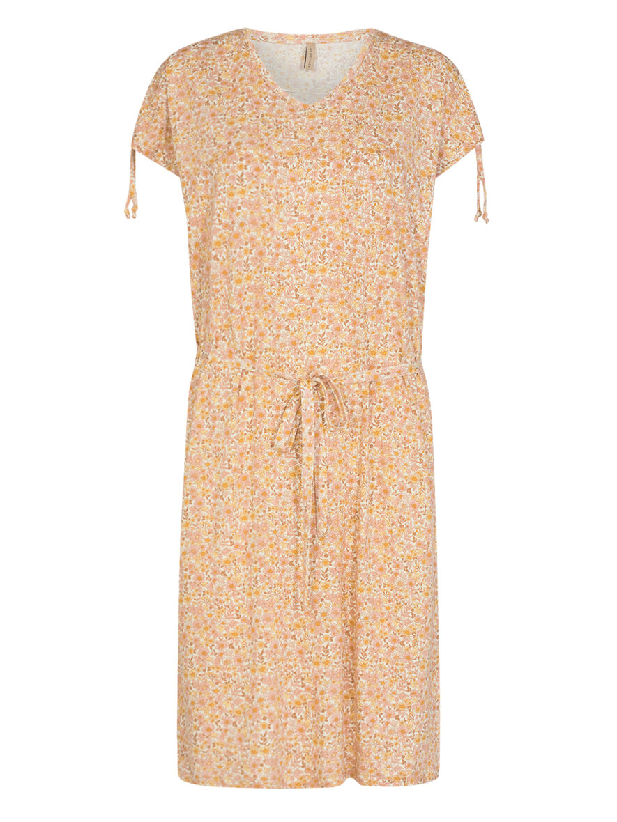 Super behagelig kjole fra Soyaconcept med all-over blomsterprint. Kjolen har rund hals og korte ærmer. Snøre ved skuldrene, kan gøre ærmet mindre og lave lidt rynke-effekt. Aftageligt bindebælte i taljen og lille slids i hver side. Max 5% krymp.
