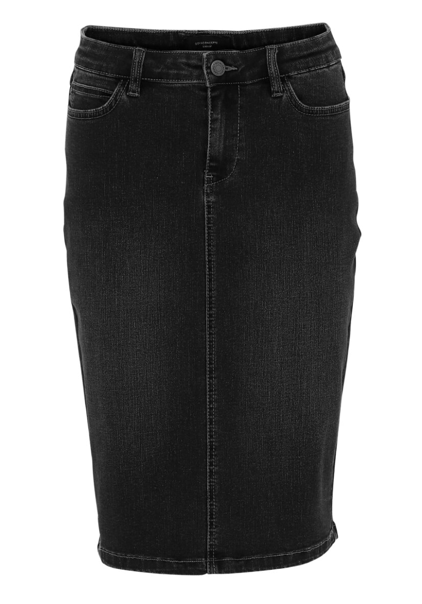 Lækker denim nederdel i sort fra Soyaconcept med knap/lynlåslukning, bæltestropper og 5-lommer.