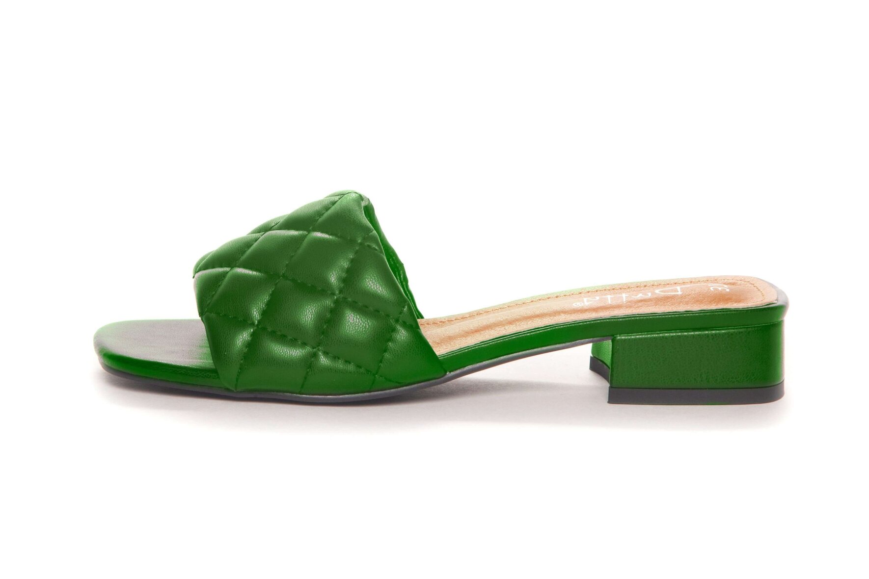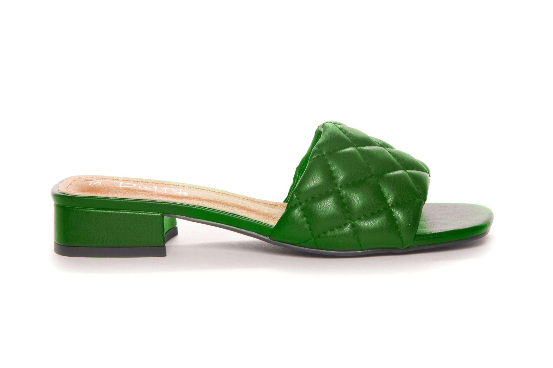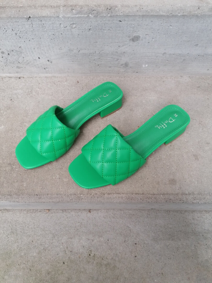 Super flot sandal med en fin quiltet overdel fra Duffy. Sandalen er lavet i imiteret skind i en skøn grøn farve. Let slip in sandal med en blokhæl på 3,5 cm.