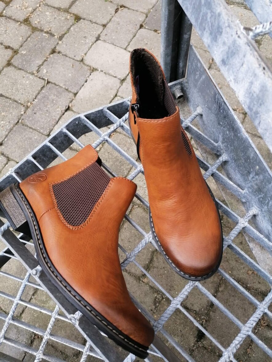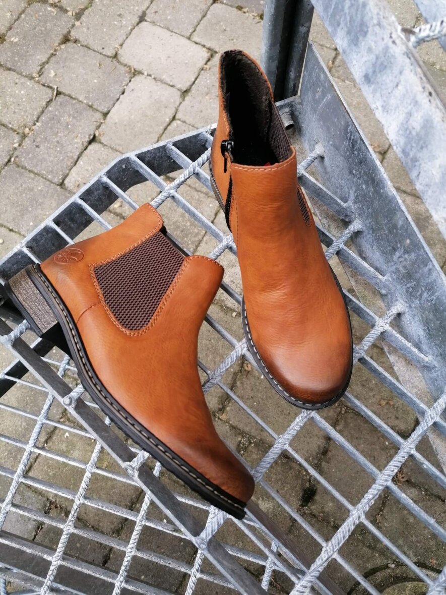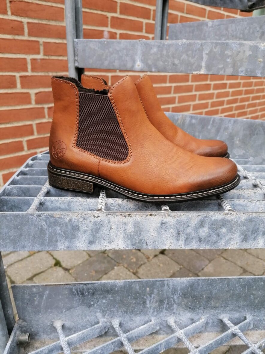Super fin og let lysebrun ankelstøvle fra Rieker med god pasform. Skoen er lavet i imiteret læder på overfladen og en let fleece forring indeni med filt sål. Skoen er med indvendig lynlås og elastik panel på ydersiden, så skoen er nem at få af og på. Støvlen er med en hælhøjde på 2,5 cm. Derudover er ydersålen af skridhæmmende. En fin støvle som kan matches med de fleste outfits med den flotte populære brune farve.