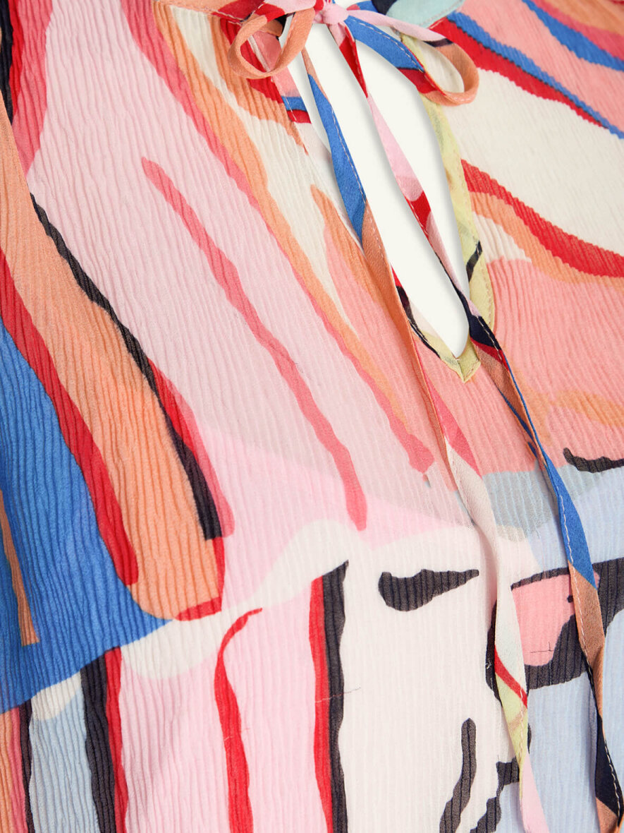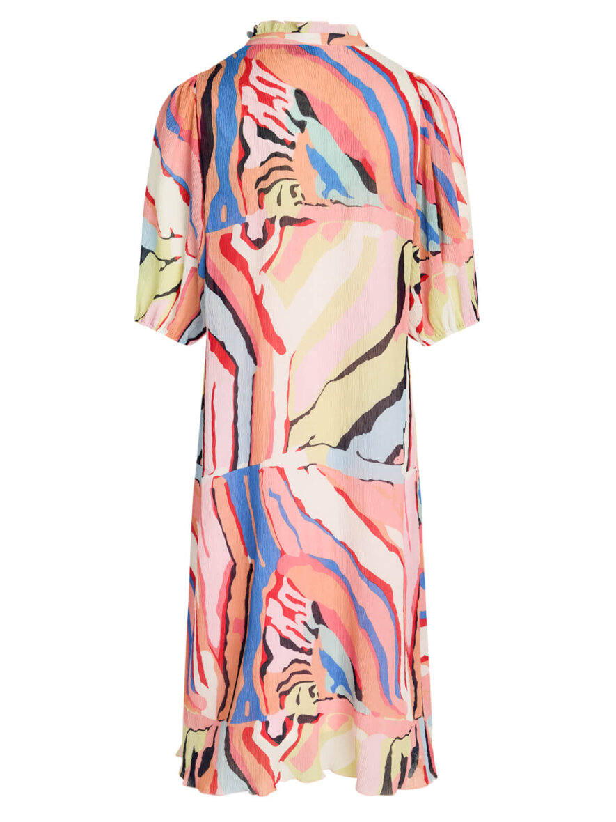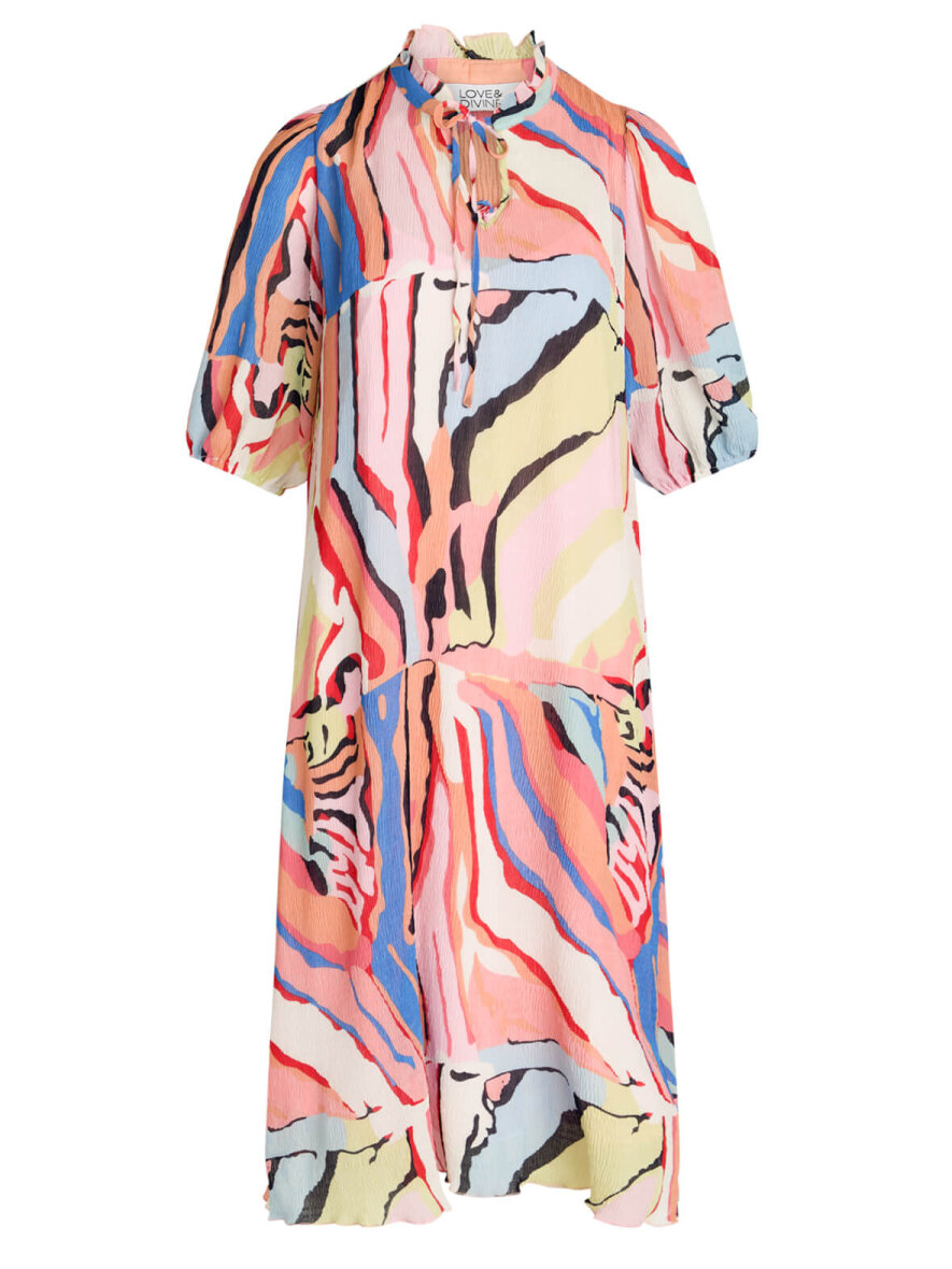 Lang smuk kjole med flot grafisk print fra Love & Divine. Rund hals med lille flæsekant og bindebånd. Halve puf ærmer med elastikkant. Underkjole medfølger.