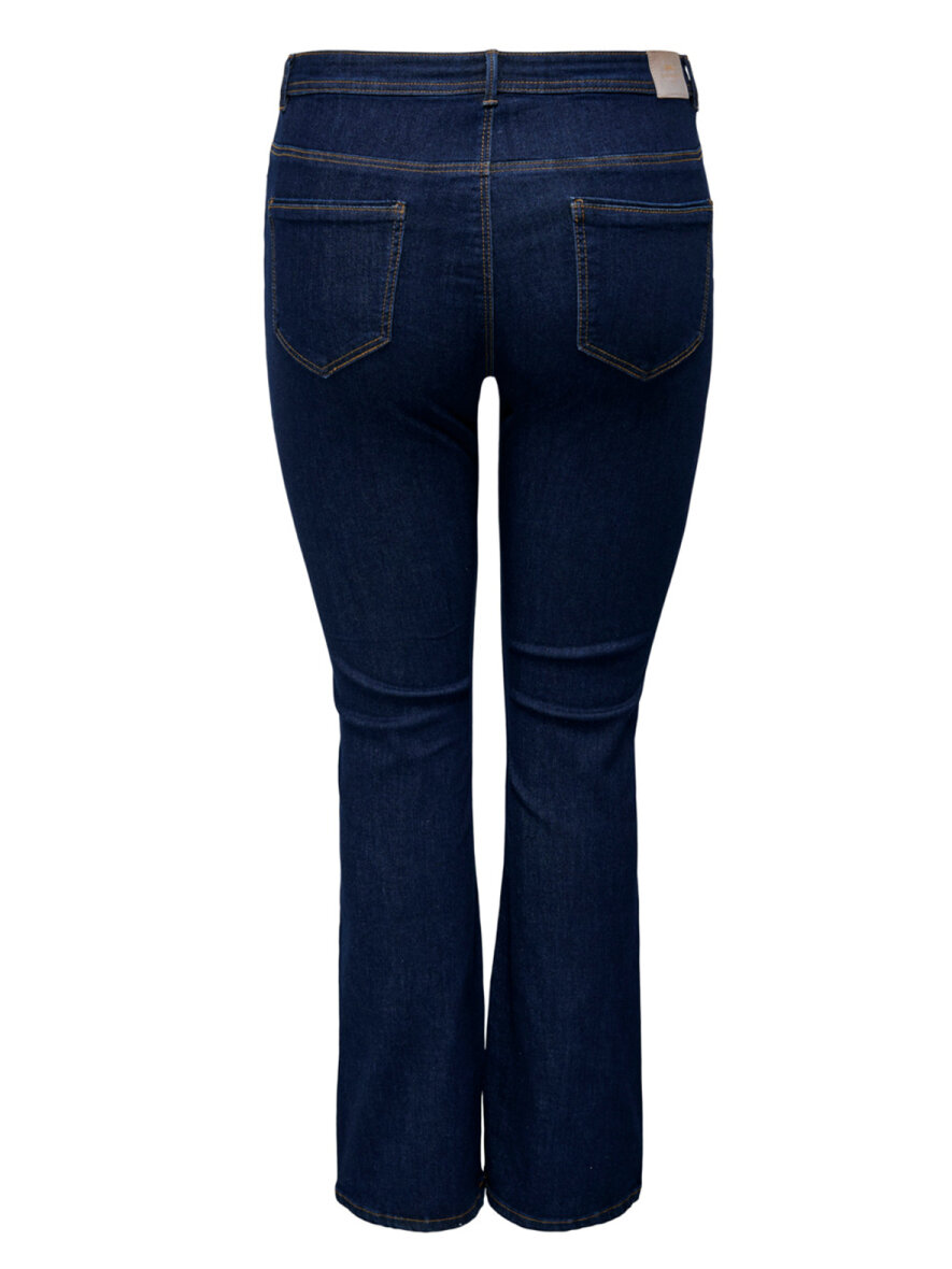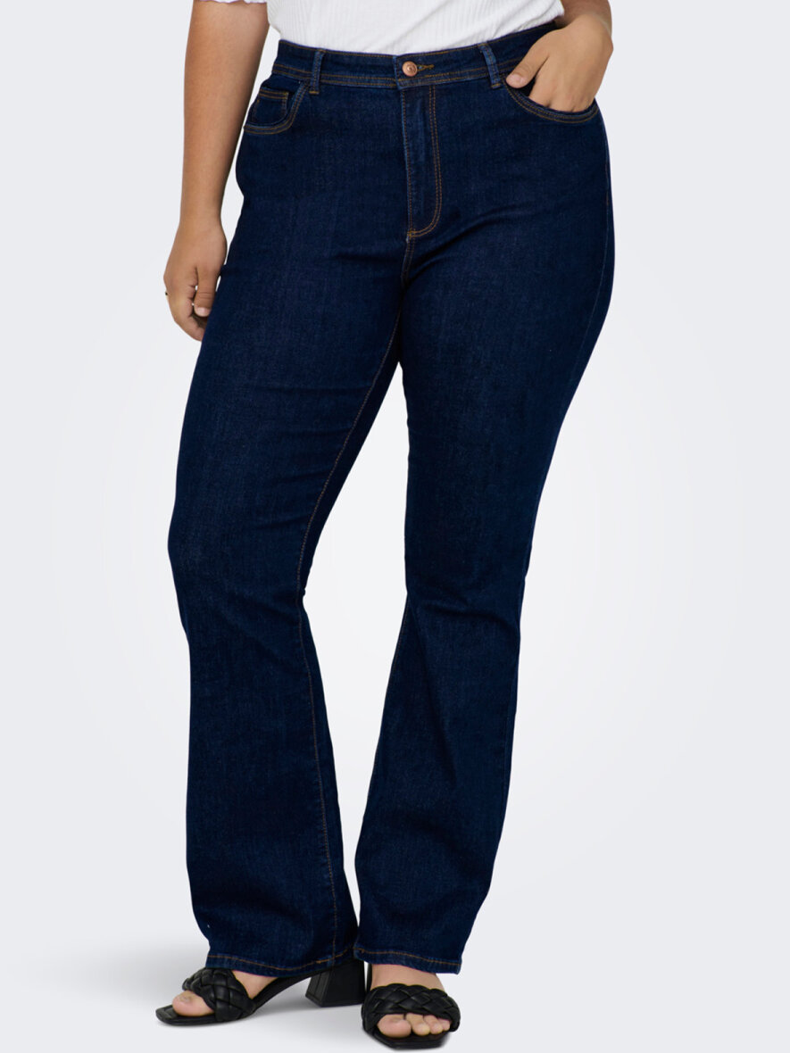 Curvy flared jeans fra ONLY CARMAKOMA med høj talje. Lukkes med knap og lynlås. Bæltestropper og har 5 lommer. God vidde i benene. Strækbart materiale.