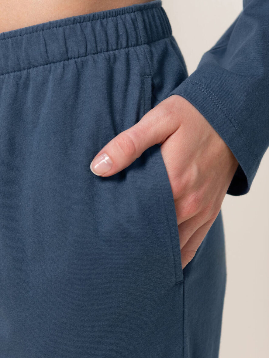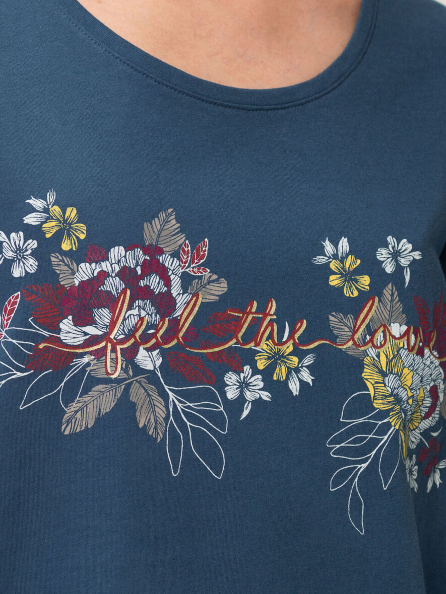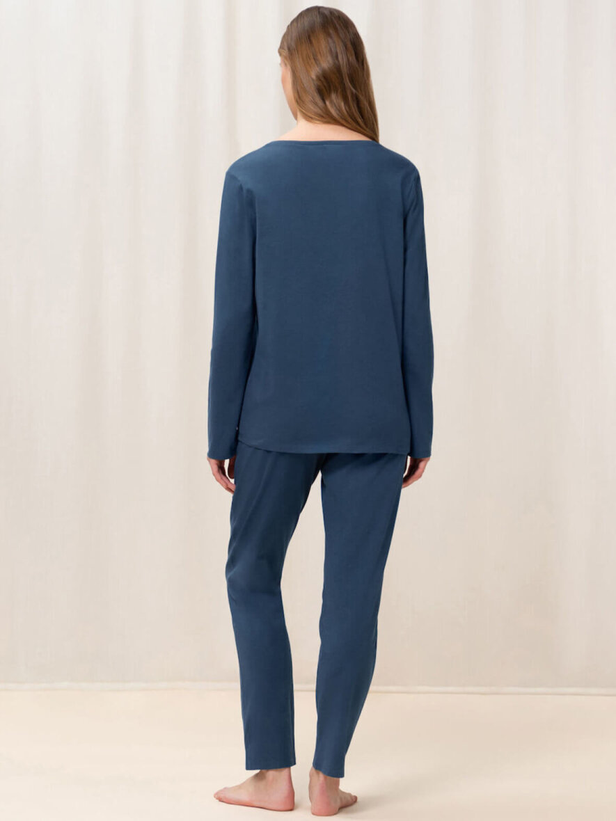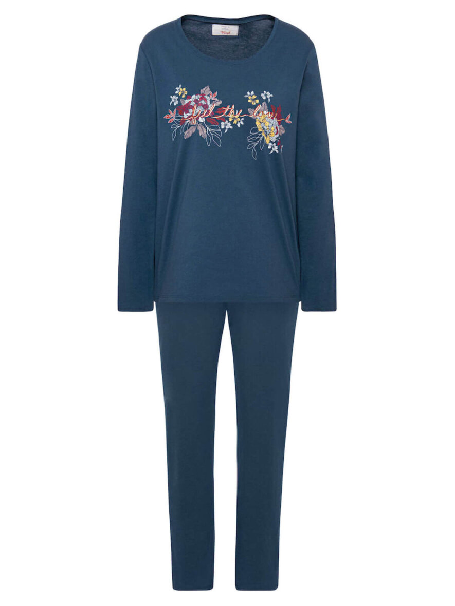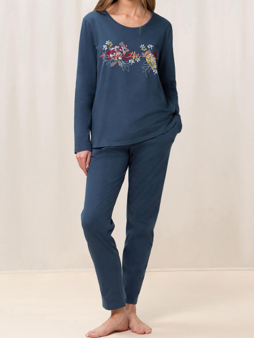 Lækker blødt nattøjssæt fra Triumph. Overdelen har rund hals og lange ærmer. Foran er der print med et statement: "Feel the Love". Underdelen har elastik i taljen og to skrålommer.