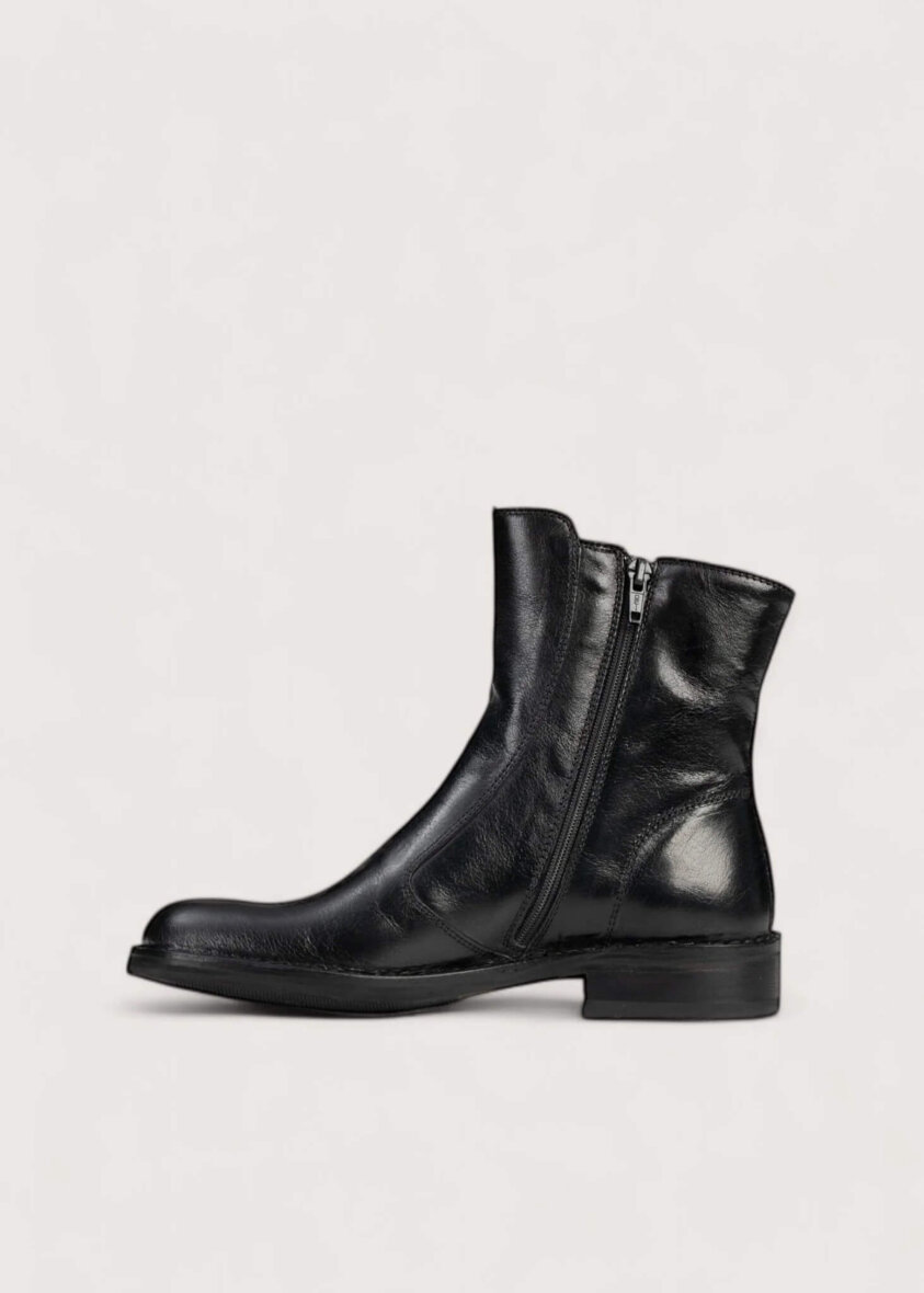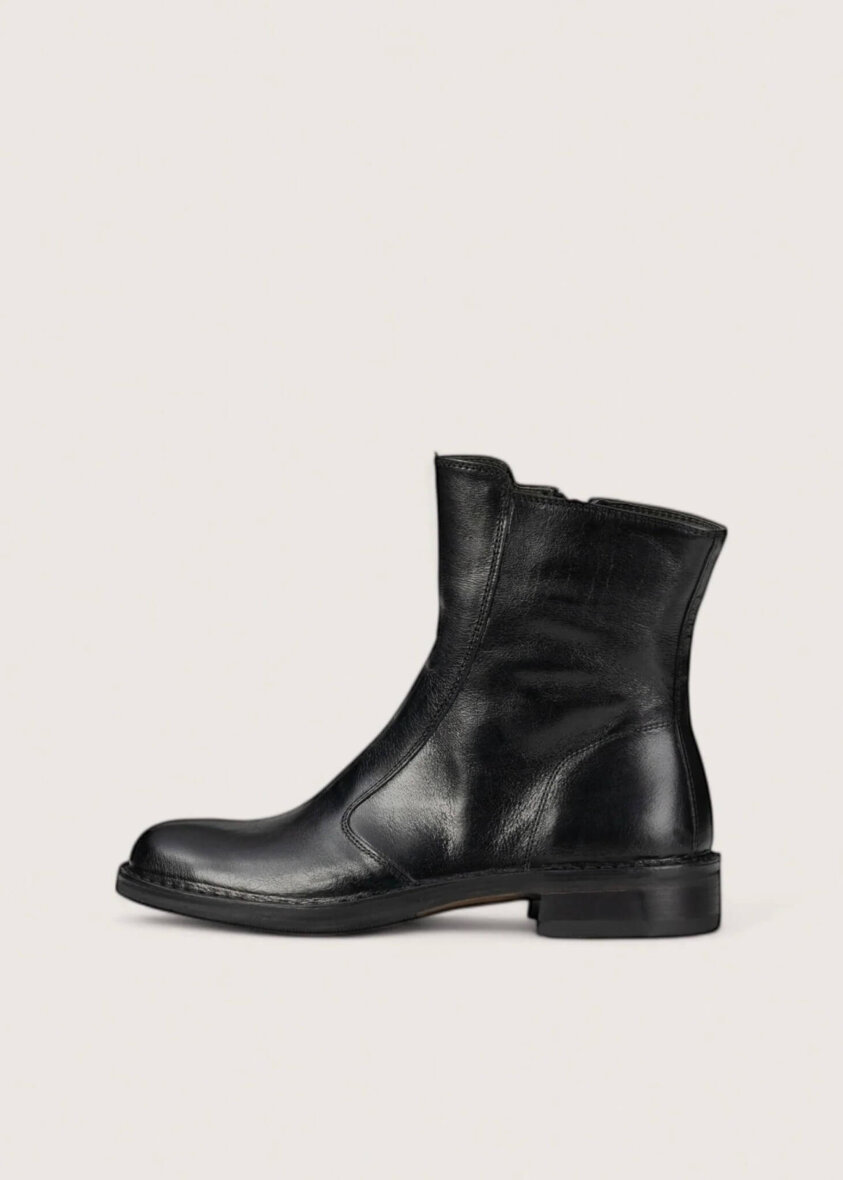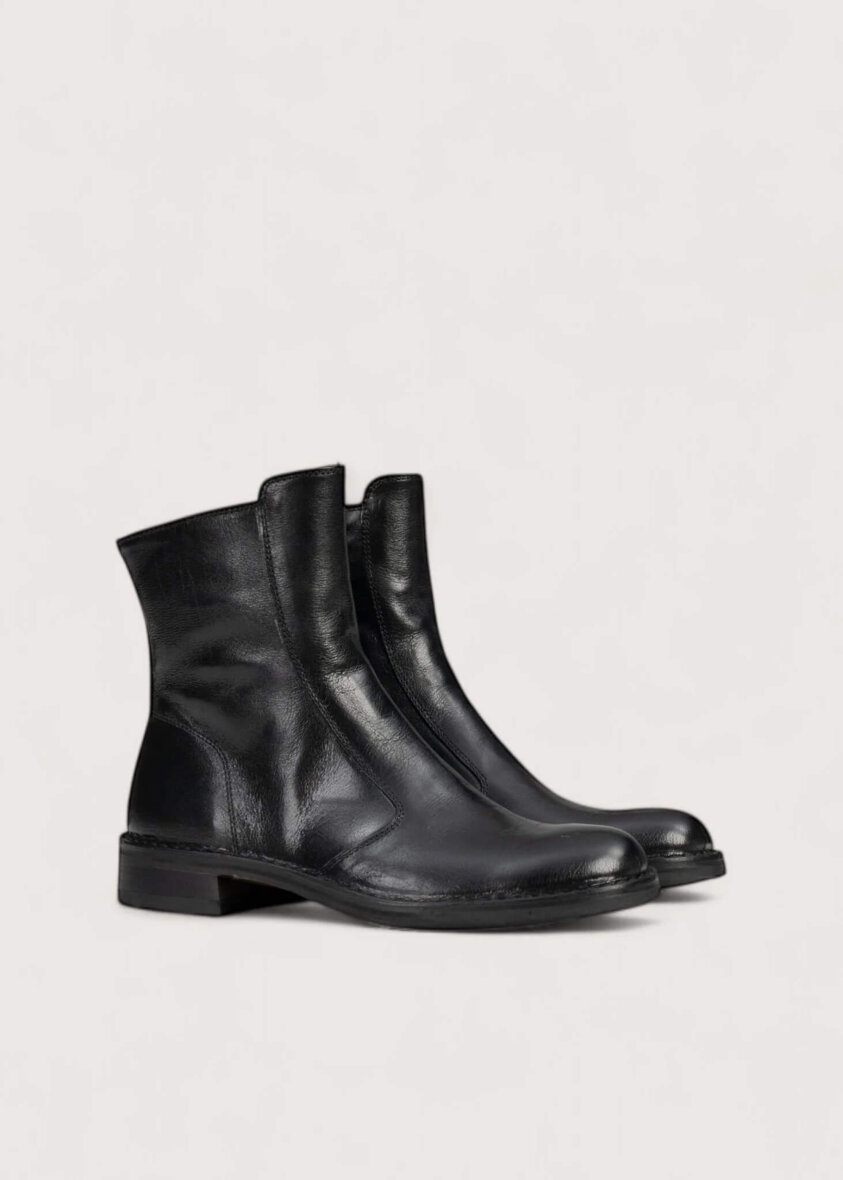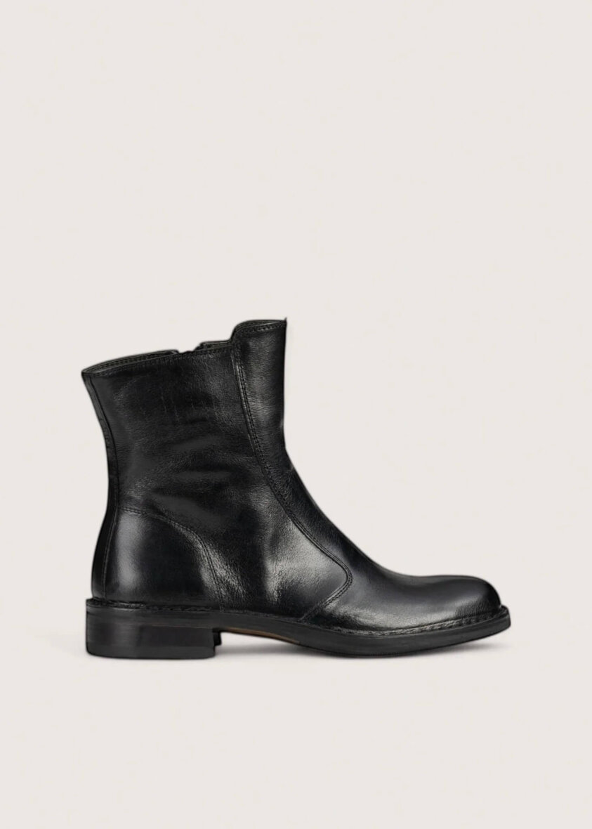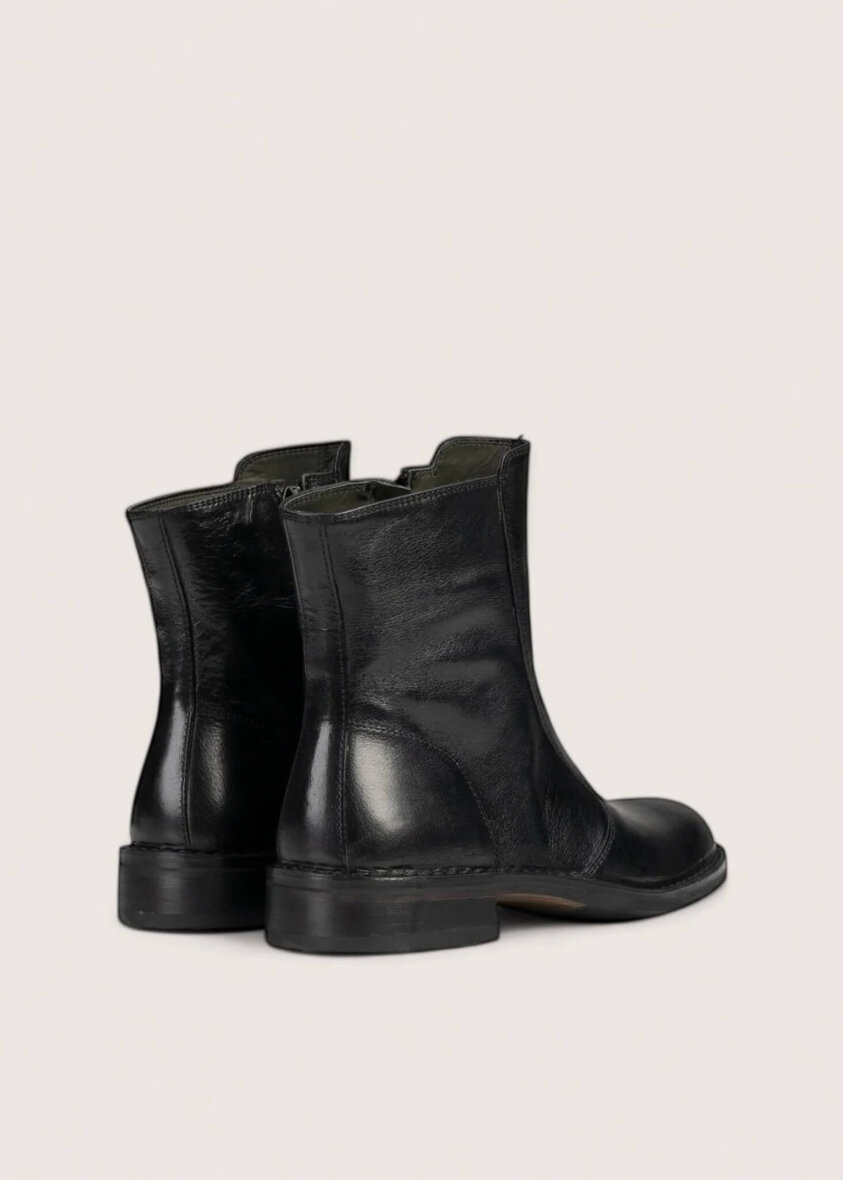 Klassisk sort skindstøvle fra Bubetti, der går et lille stykke op på anklen og sidder super flot til. Håndsyet støvle i vegetabilsk garvet skind. Sort nylon lynlås på inderside. Sorte gummisåler.