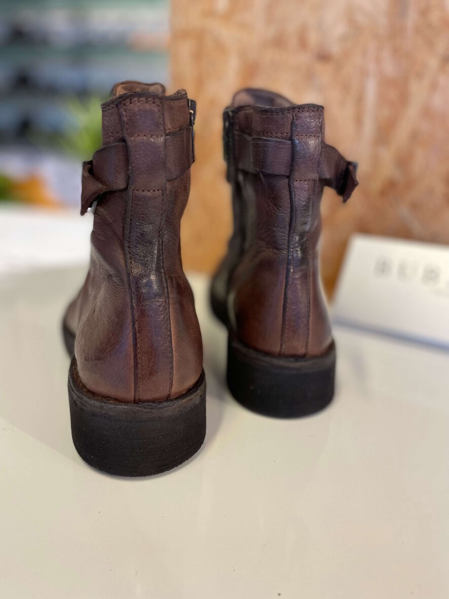 Smart støvle fra Bubetti i vasket skind i en dyb mørkebrun farve. Støvlen har lynlås på siden og fletremme på skaftet som giver smart look.