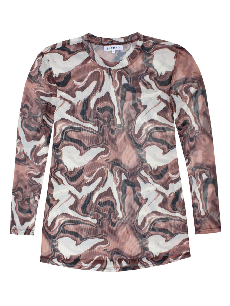 Super flot mesh bluse fra Zhenzi i et tyndt og lækkert materiale. Rund hals og lange ærmer. Brune nuancer med lidt off white.