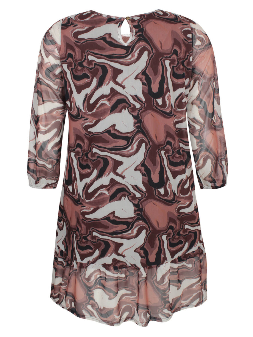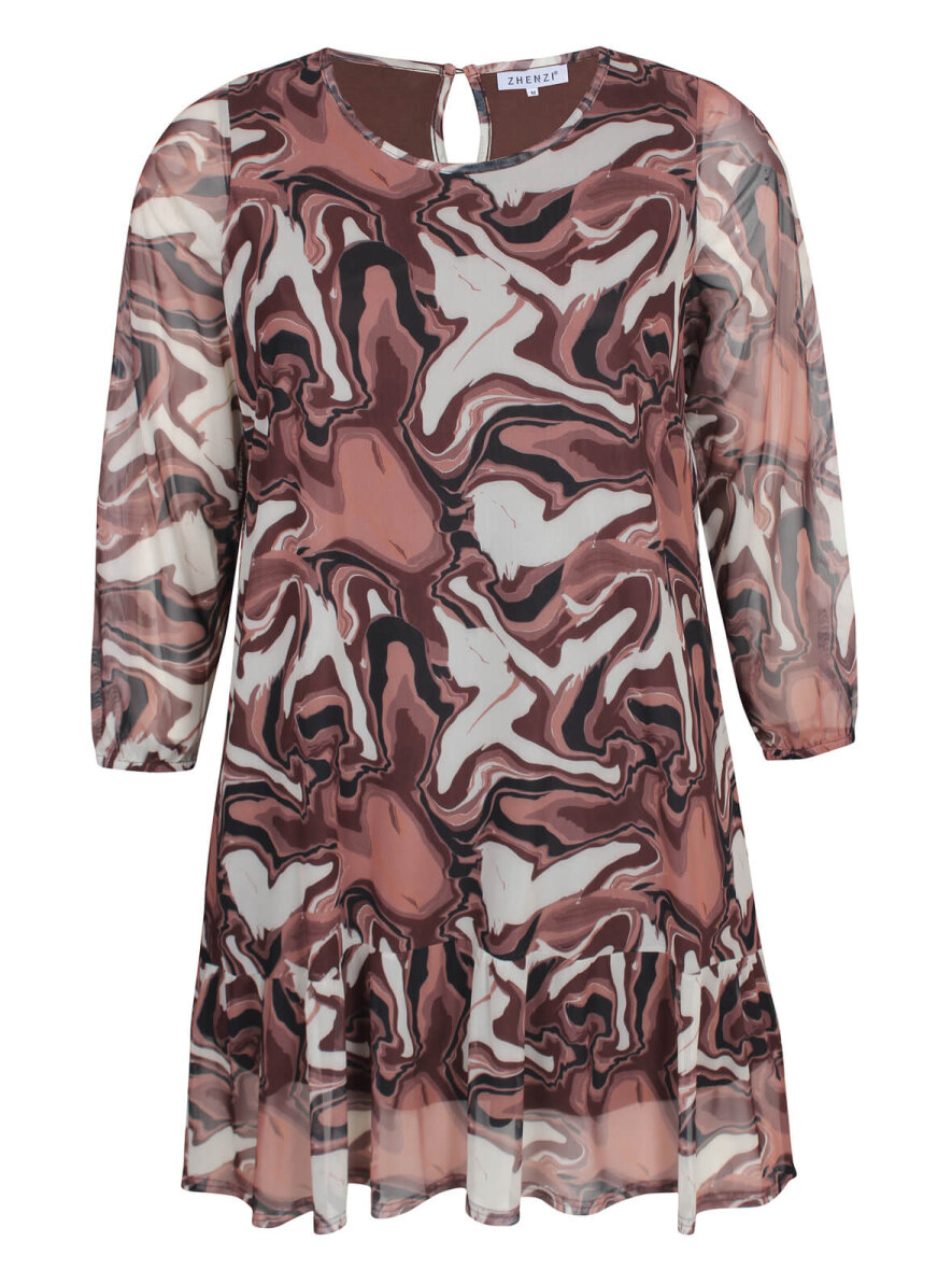 Super smart kjole fra Zhenzi - en 2-delt kjole med en over- og underkjole. Overkjolen er i mesh og med flotteste print i brune nuancer. Den inderste del er i en smuk mørkebrun farve. Rund hals og lukkes med en knap i nakken. Lange ærmer. Flæse nederst på kjolen. Max 3% krymp.