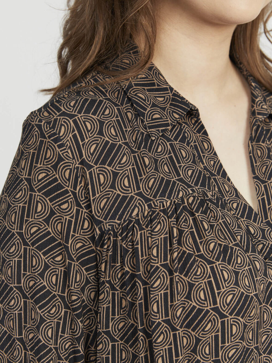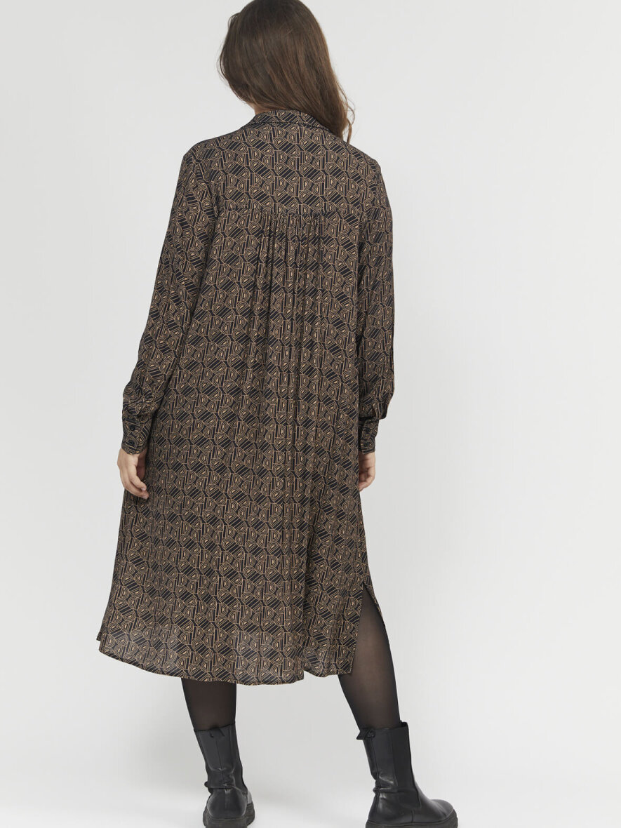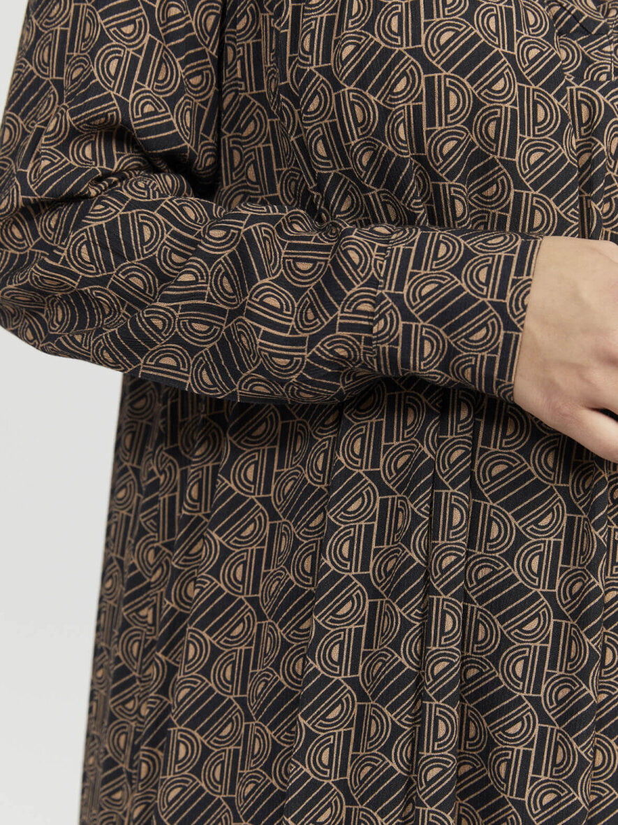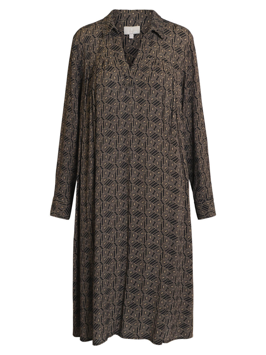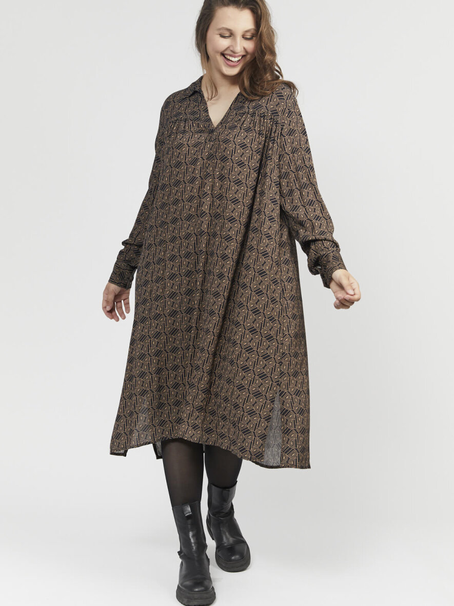 Super elegant kjole fra Brandtex med det fineste mønster i camel på sort baggrund. Krave med V-udskæring. Lange ærmer med manchetknapluk ved håndleddene. Kjolen har A-facon og slids i siderne. Max 5% krymp.