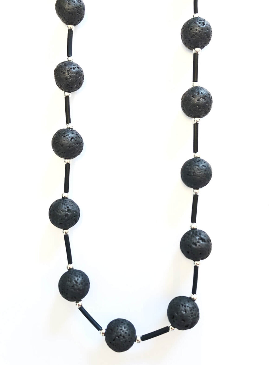 Super flot halskæde fra JK Necklace med lava-sten. Mellem hver lava-sten er der sølvfarvede perler og et stykke sort gummi. Halskæden er 90 cm. lang.