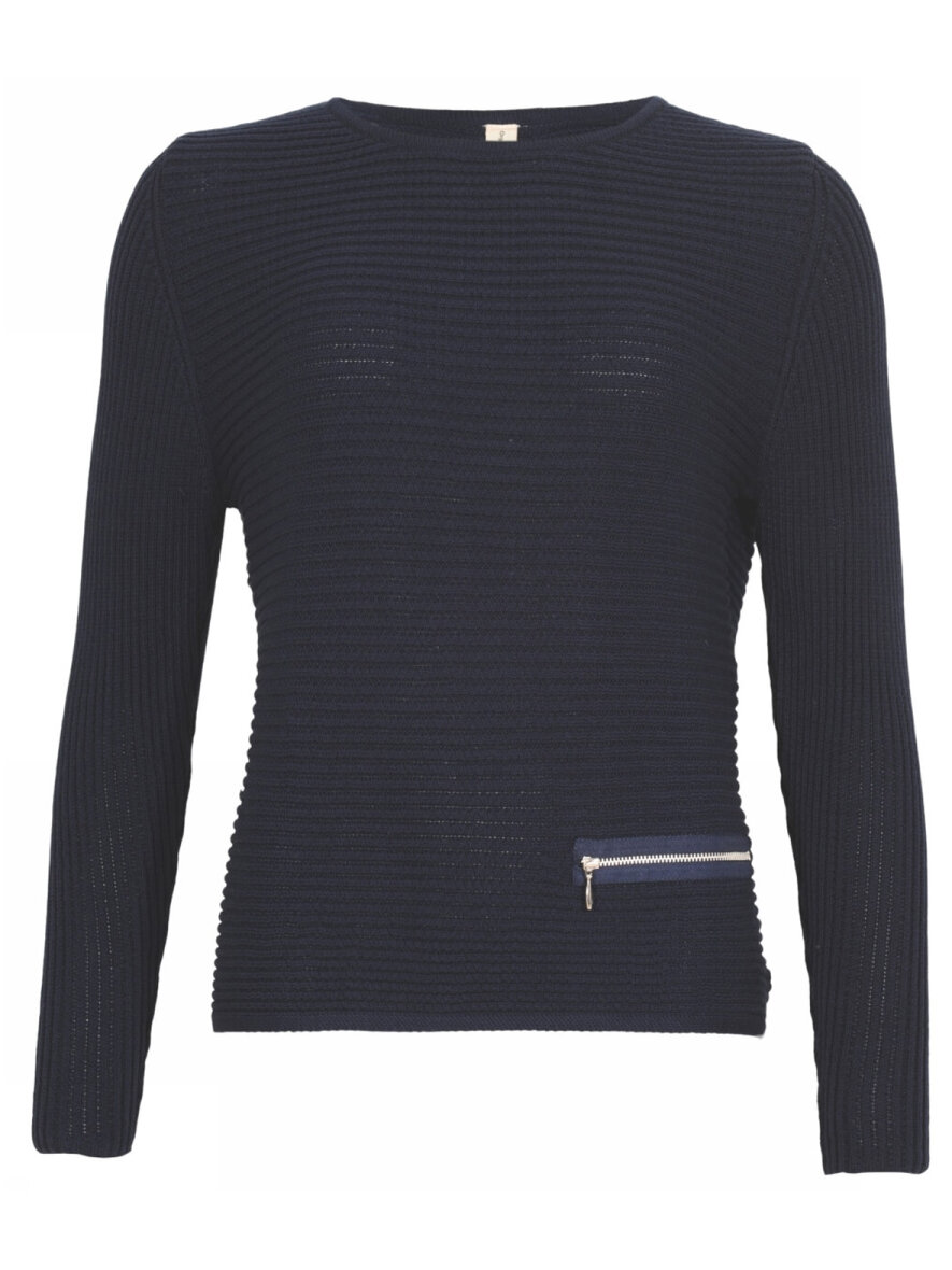 Lækker strik fra Skovhuus i klassisk design med rillet strikmønster i en skøn bomuldskvalitet. Rund halsudskæring og dekorativ lynlåseffekt forneden foran.