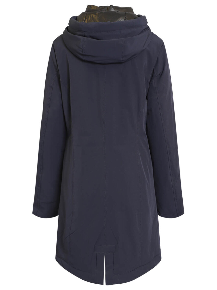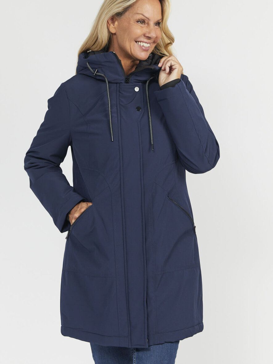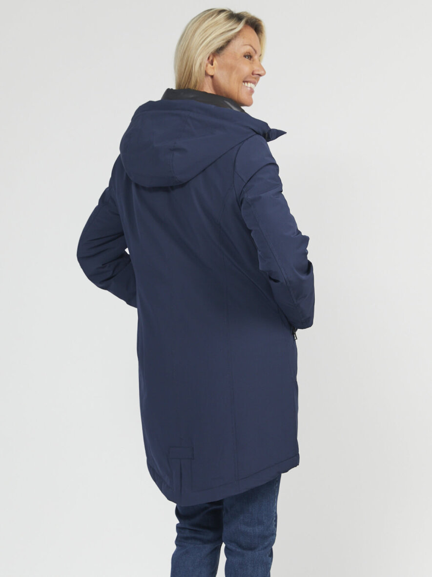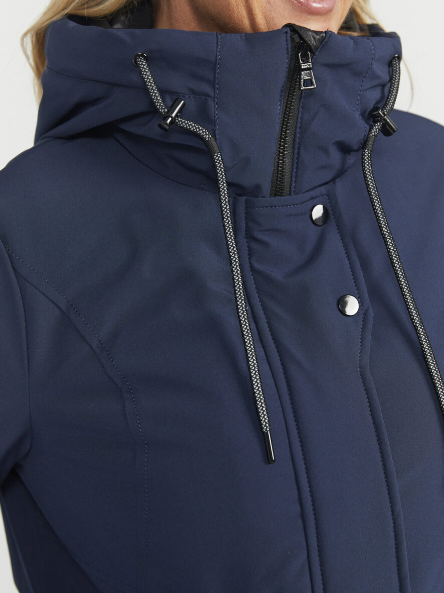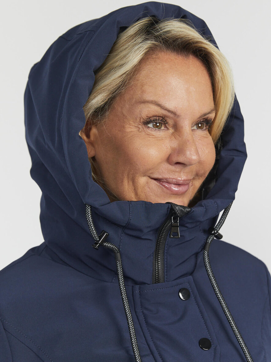 Super lækker vind- og vandtæt jakke fra Brandtex i navy. Jakken har høj krave og fast hætte med snøre. Lukkes med lynlås og trykknap bag stolpeluk. To skrålommer med lynlås. Påsyet ribkant ved håndleddet, der gør at den holder vind ude. Max 5% krymp.