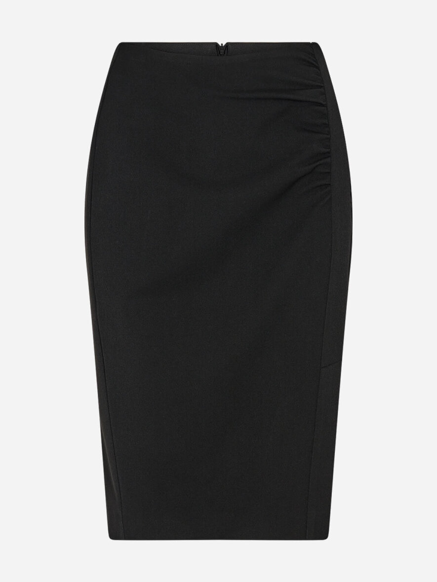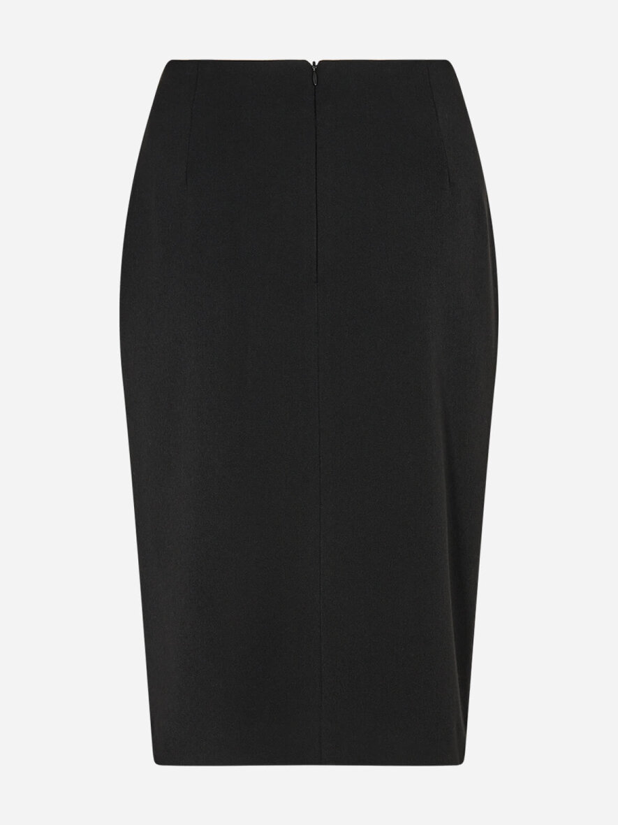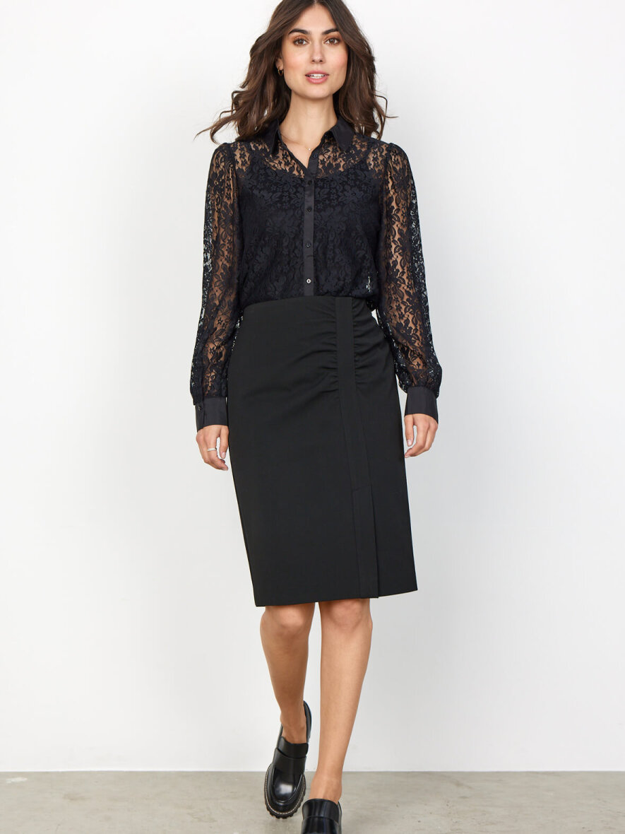 Super feminin midi nederdel fra Soyaconcept i sort. Fine detaljer og lille slids foran. Lukkes bagpå med lille lynlås.