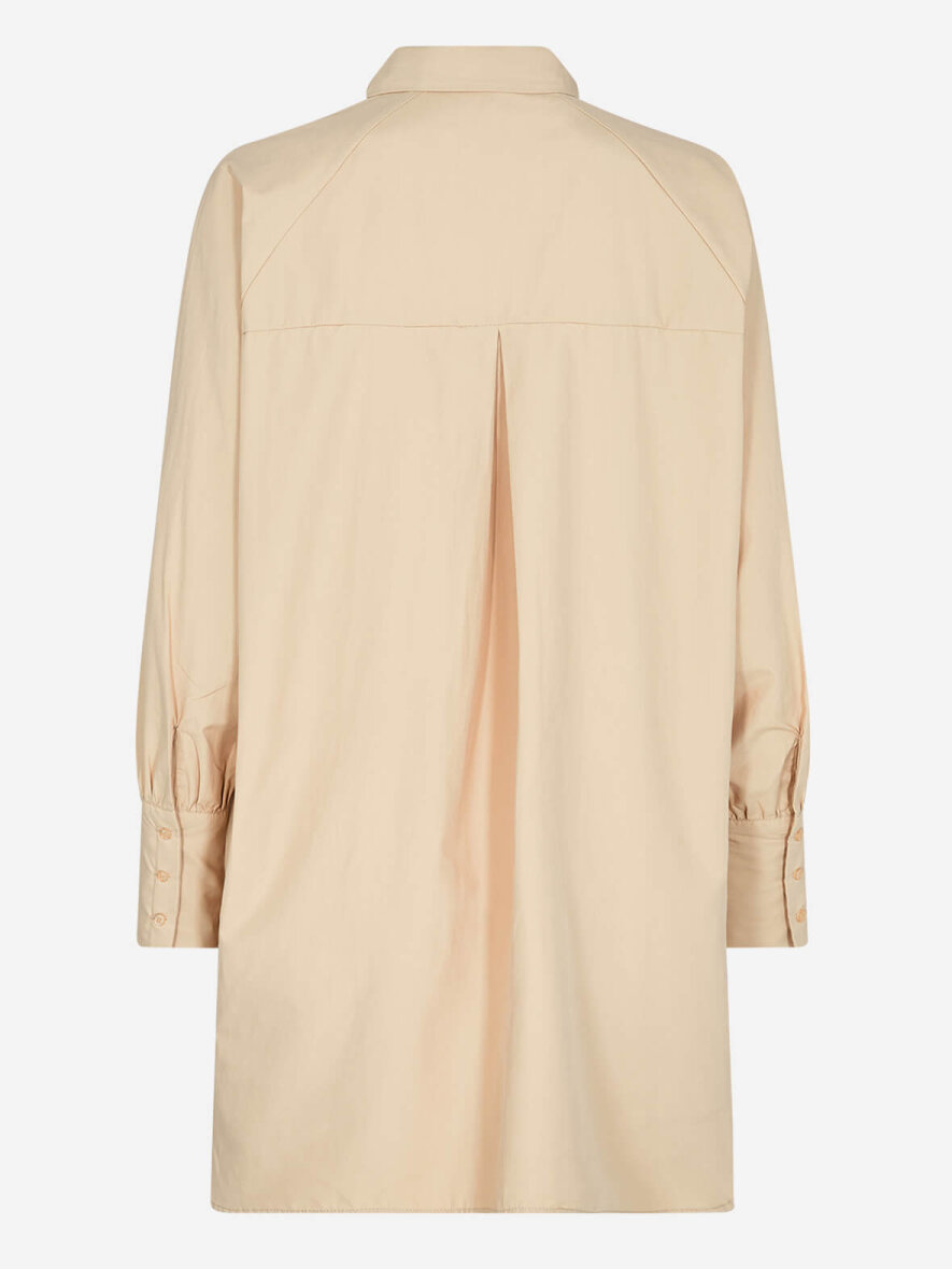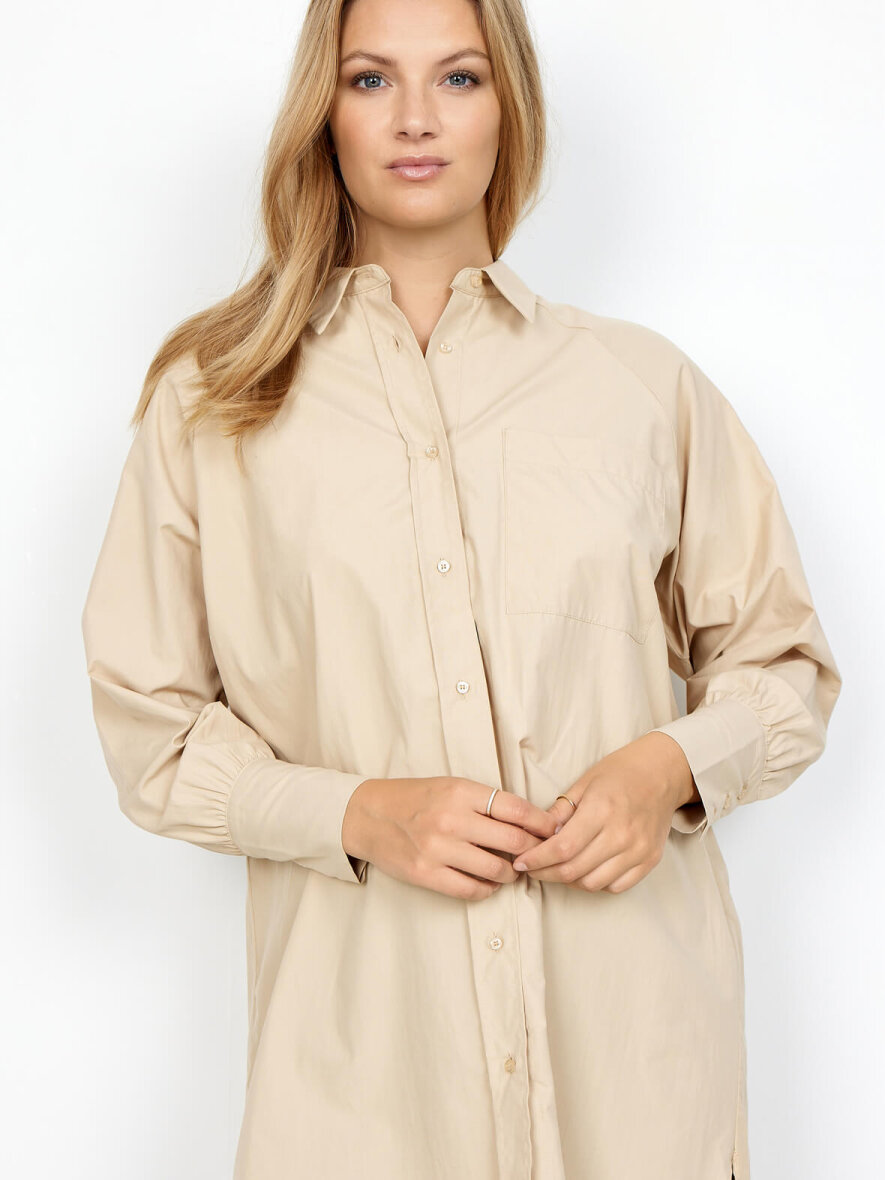 Klassisk lang creme-farvet skjorte fra Soyaconcept i genbrugt polyester og økologisk bomulds-blanding. Klassisk krave og gennemgående knapluk ned foran bag stolpeluk. Lange ærmer med manchetknapluk. Let runding forneden på skjorten.