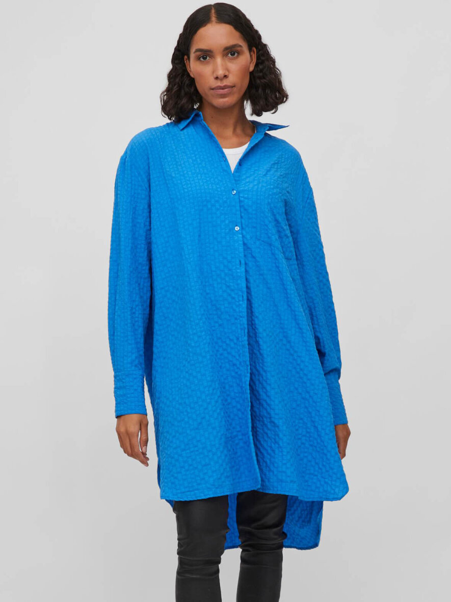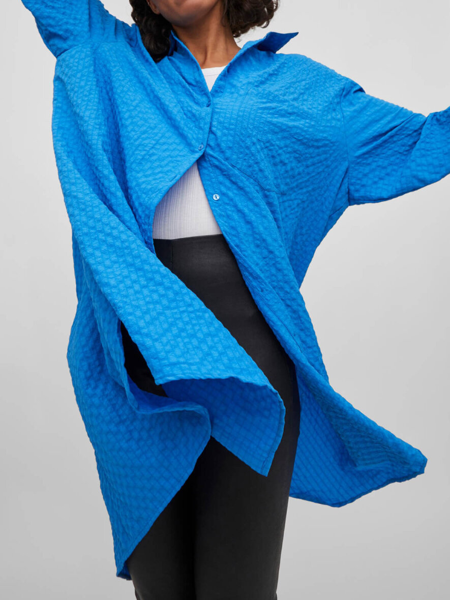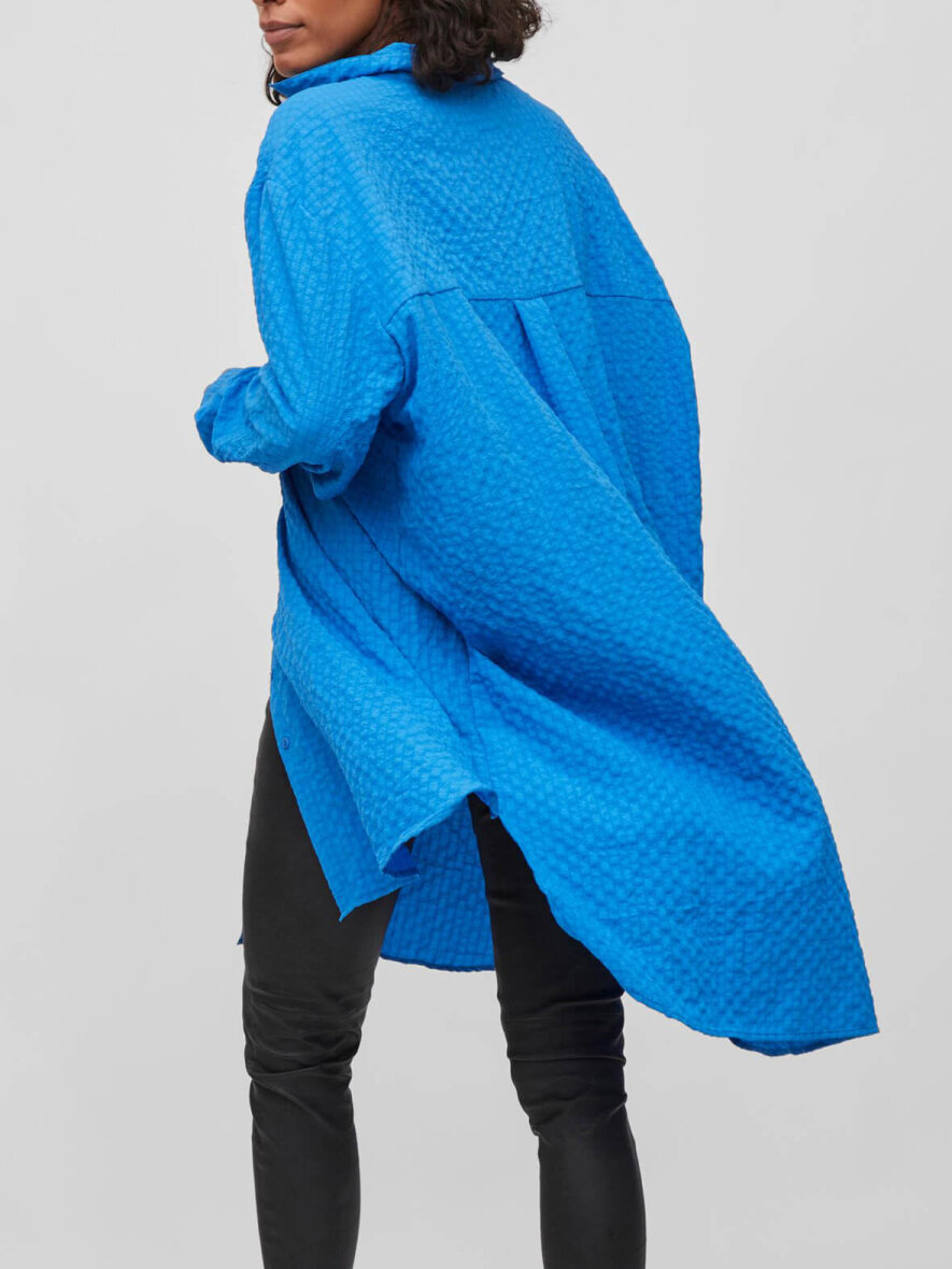 Oversized skjorte fra VILA i en lækker blå farve. Skjorten har klassisk krave og knapluk hele vejen ned foran. Lange ærmer med manchetknapluk. Let runding forneden og er en smule længere bagtil. Skjorten har tekstur i materialet.