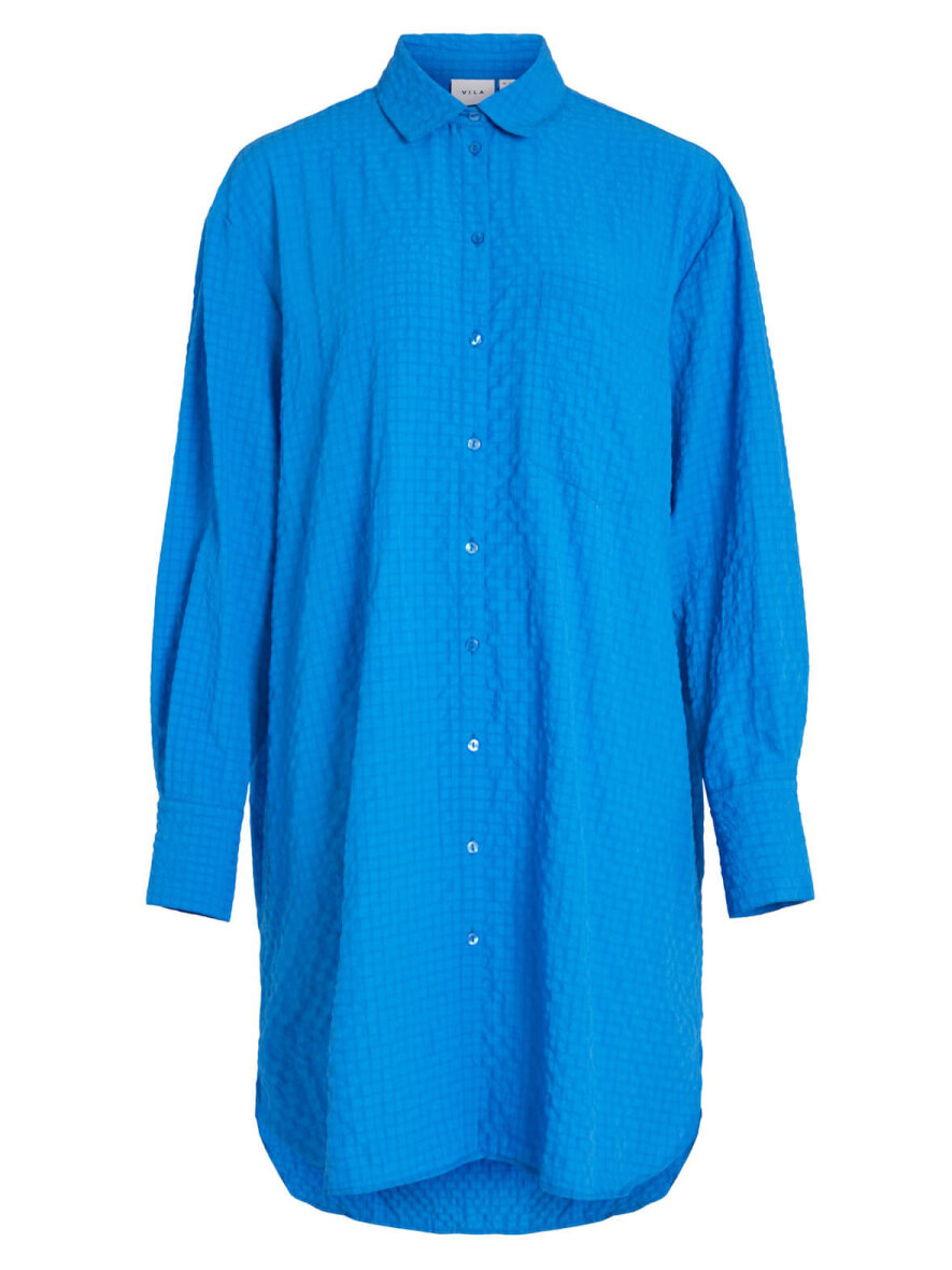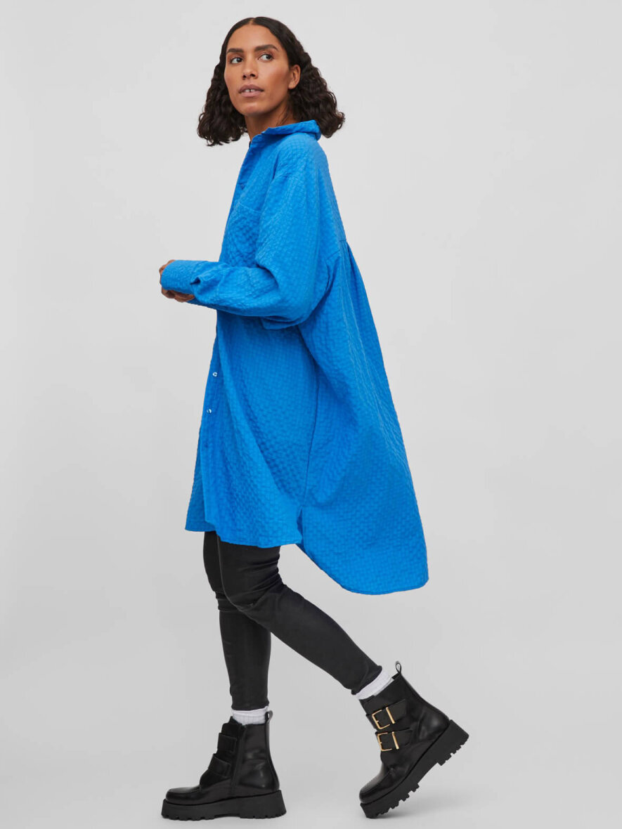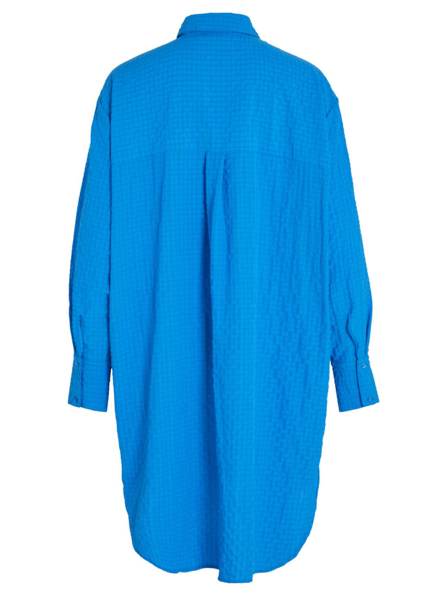 Oversized skjorte fra VILA i en lækker blå farve. Skjorten har klassisk krave og knapluk hele vejen ned foran. Lange ærmer med manchetknapluk. Let runding forneden og er en smule længere bagtil. Skjorten har tekstur i materialet.