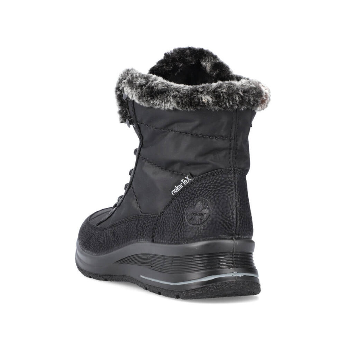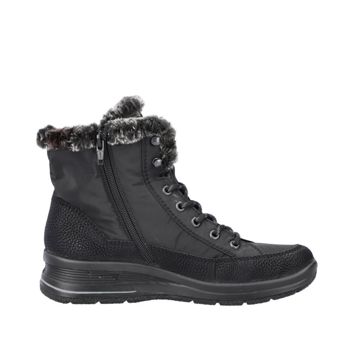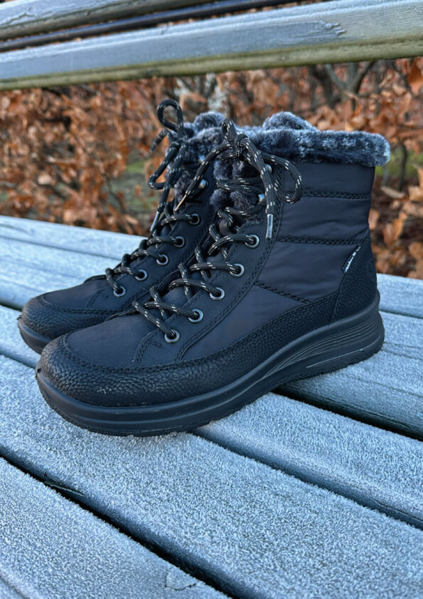 Komfortabel vinterstøvle fra Rieker. Støvlen er lavet i sort imiteret skind og nylon med en fin imiteret pelskant. Støvlen er lavet i Rieker Tex, hvilket gør den vandafvisende. Indeni er støvlen foret med varm tekstil foring, så man kan holde fødderne varme i de kolde vinter måneder. Støvlen er med regulerbare snørebånd og lynlås på indersiden, så den nem at få af og på.