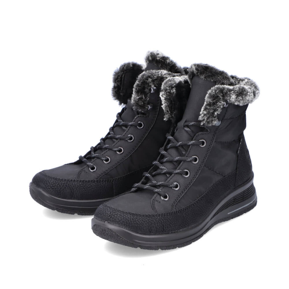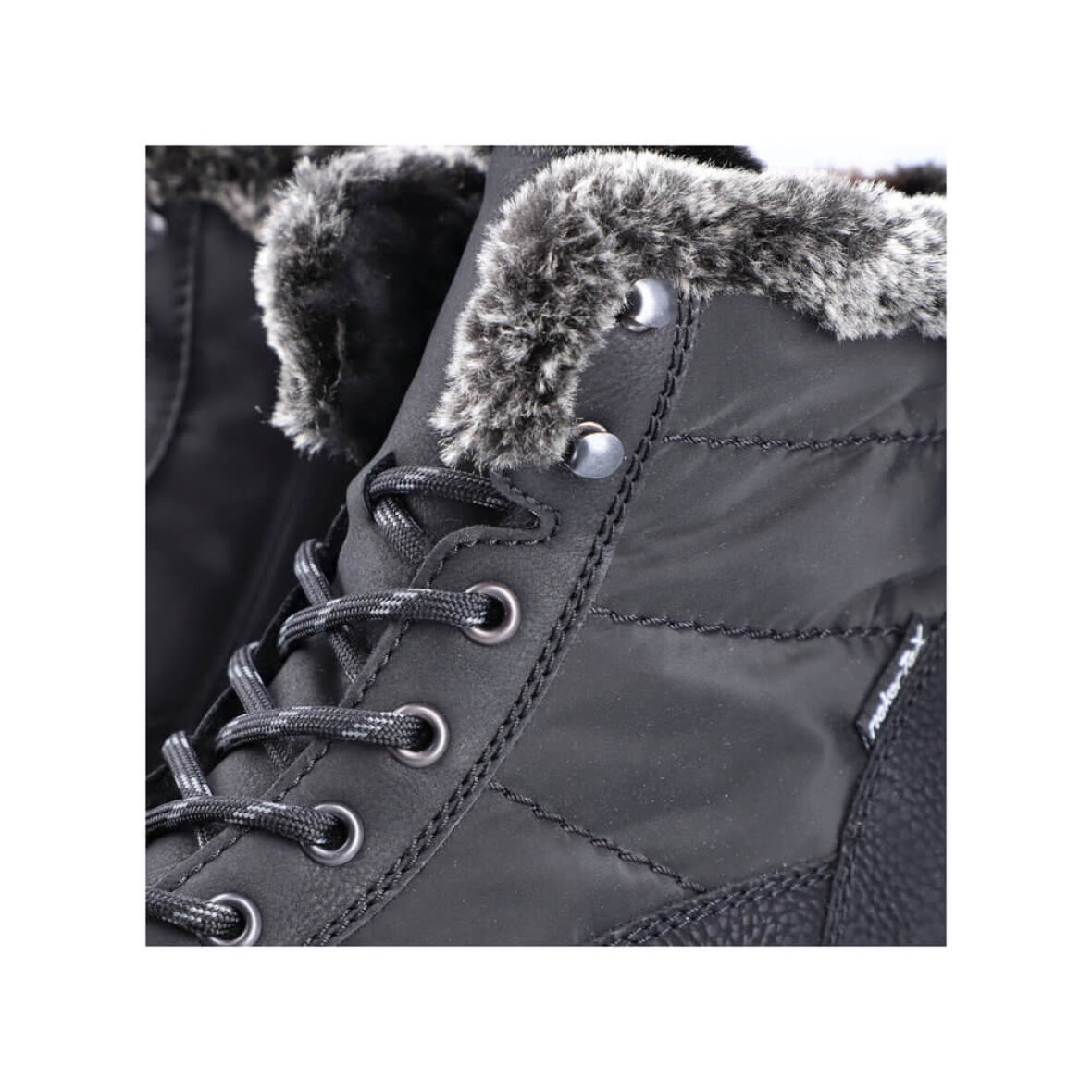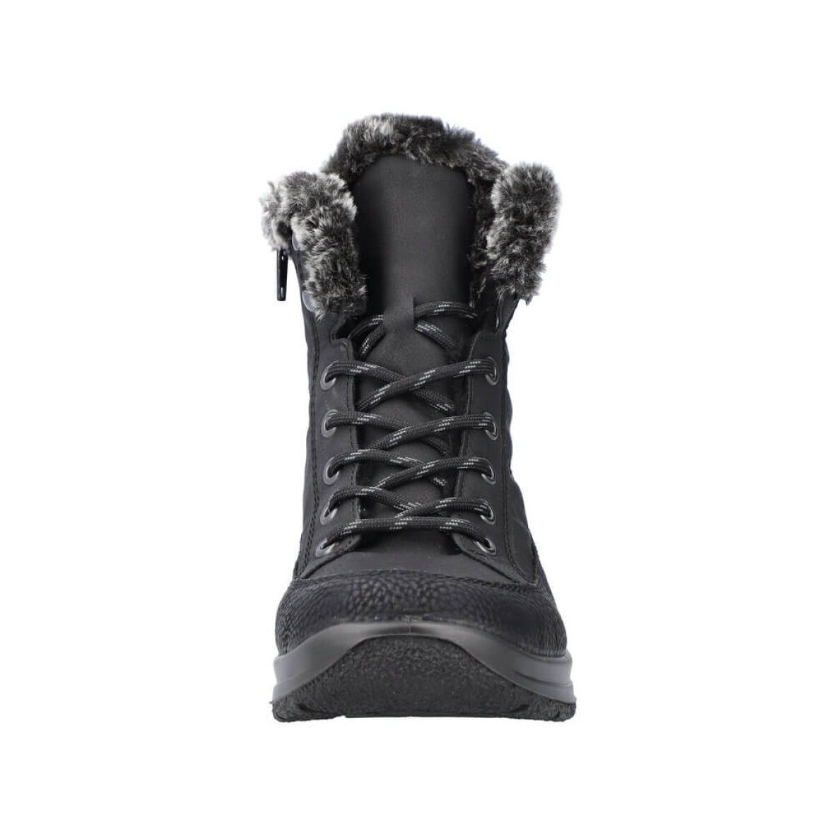 Komfortabel vinterstøvle fra Rieker. Støvlen er lavet i sort imiteret skind og nylon med en fin imiteret pelskant. Støvlen er lavet i Rieker Tex, hvilket gør den vandafvisende. Indeni er støvlen foret med varm tekstil foring, så man kan holde fødderne varme i de kolde vinter måneder. Støvlen er med regulerbare snørebånd og lynlås på indersiden, så den nem at få af og på.