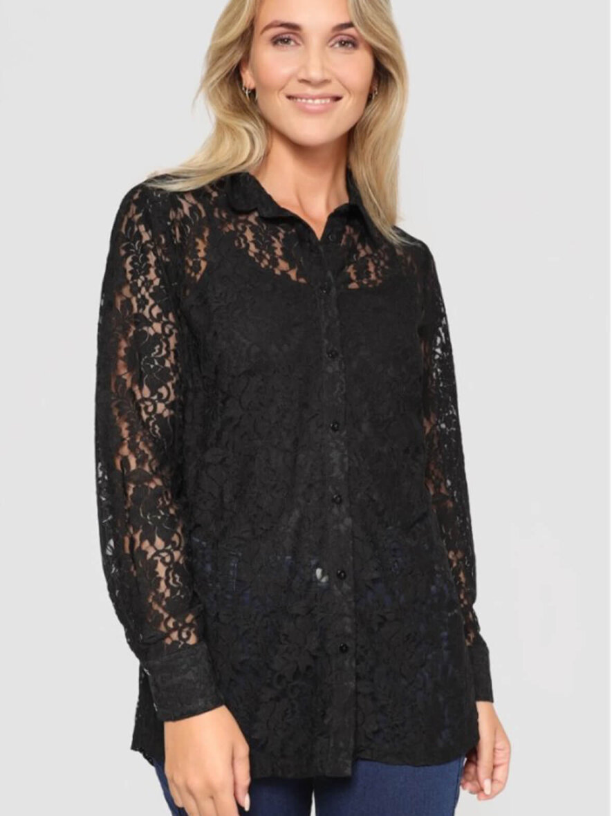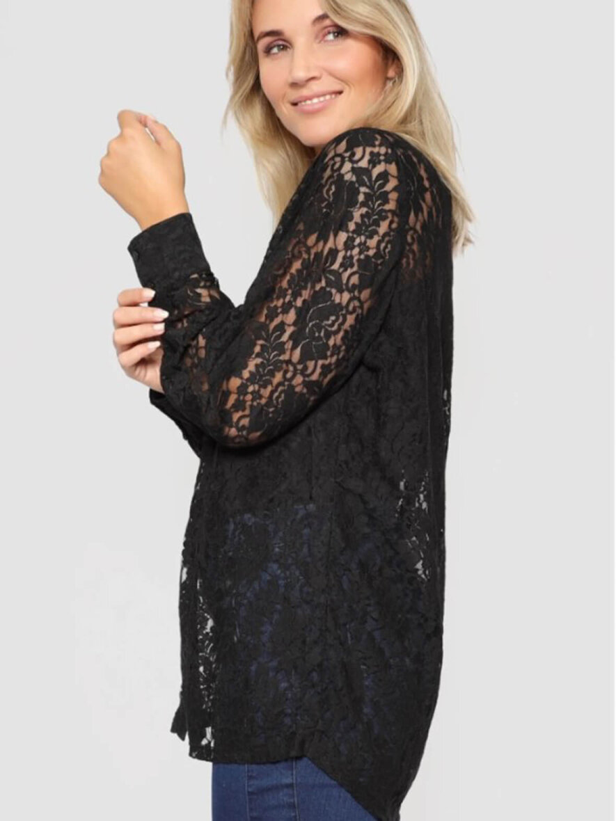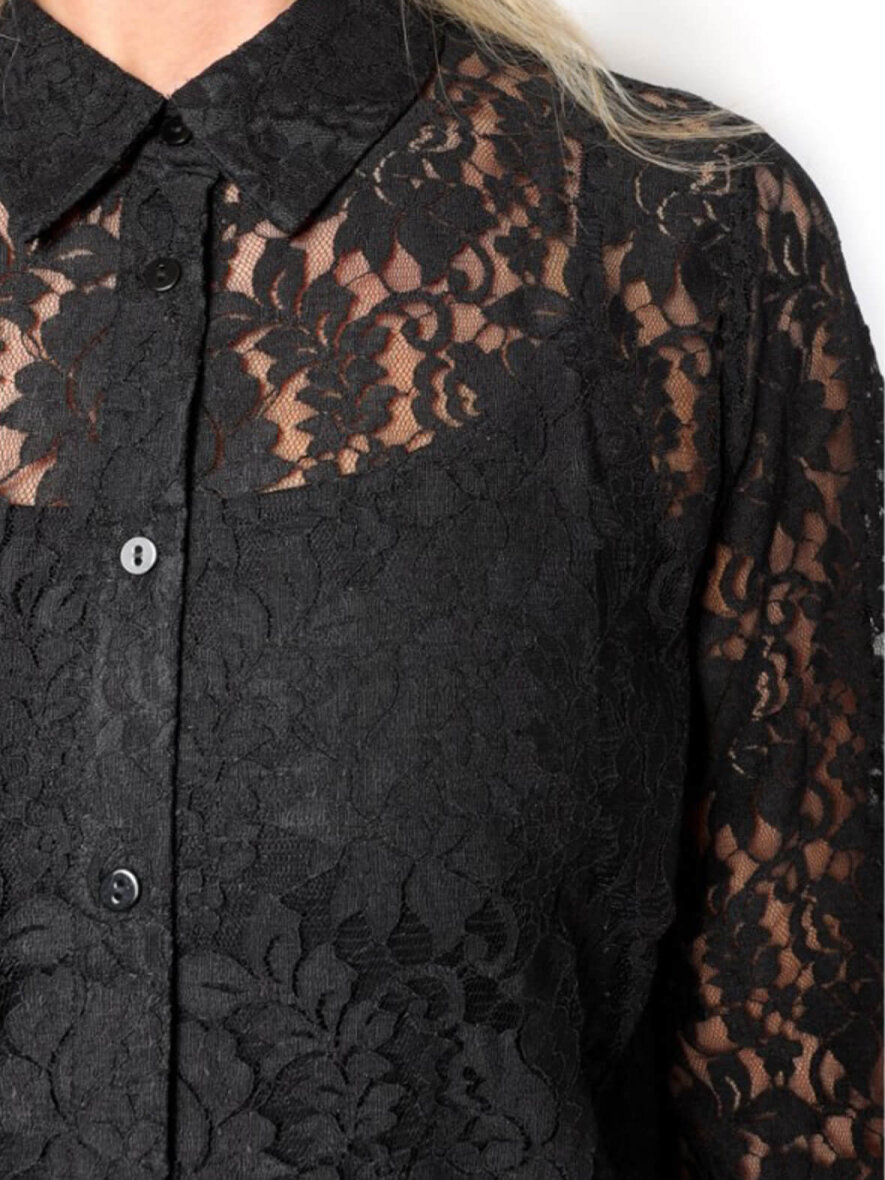 Elegant blondeskjorte fra 2-Biz med masser af lækre detaljer. Klassisk krave og gennemgående knapluk ned foran. Lange ærmer med manchetknap. Blondestoffet er med blomstret mønster. Kan bruges til både hverdag og fest.